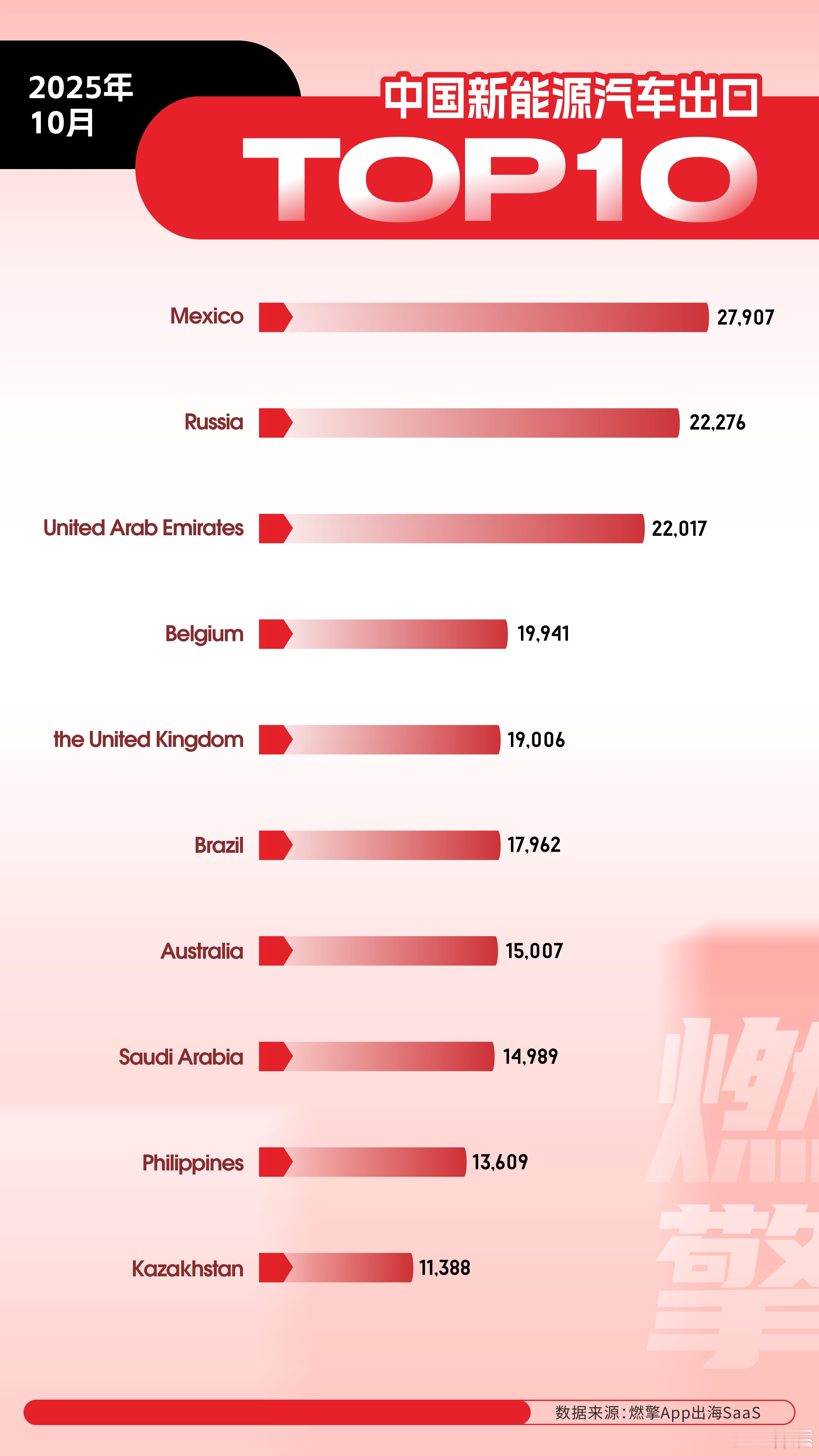 中国新能源汽车10月出口,墨西哥遥遥领先10月,中国新能源汽车出口呈现出多元化、精准化的市场布局特征。前十大出口目的地覆盖了北美、新兴市场、欧洲、中东及南半球等多个关键区域,不仅与整体汽车出口版图高度重合,更凸显了针对不同市场政策与消费需求进行精准车型适配的核心策略。从各市场出口策略看,其逻辑与产品侧重各有不同。墨西哥作为重要的北美门户,当月吸纳了27907辆中国新能源汽车,其中纯电SUV及经济型轿车成为主力,依托区域贸易协定,以此为跳板服务于北美家庭市场。在新兴市场,中国品牌迅速填补了当地供给缺口。面向俄罗斯(22276辆)和哈萨克斯坦(11388辆)的出口,主要以长续航纯电SUV和混动车型为主,旨在满足日常通勤并适应其复杂的道路环境。中东高端市场方面,阿联酋(22017辆)和沙特(14989辆)对中国高端新能源车型的需求显著,智能纯电SUV和豪华轿车凭借出色的设计与配置,成功契合了当地高收入群体的消费偏好。欧洲市场则体现了枢纽与终端并重的特点。比利时(19941辆)作为关键物流枢纽,将大量纯电车型分销至欧洲各国;英国(19006辆)作为直接终端市场,则主要接收高性价比的纯电SUV和混动车型,以满足其中端家庭用户的需求。此外,政策与需求共同驱动了对巴西(17962辆)、澳大利亚(15007辆)和菲律宾(13609辆)的出口。针对巴西和菲律宾,经济型纯电轿车和小型SUV是主打产品;对澳大利亚的出口则以纯电SUV为主,有效抓住了当地环保政策与家庭出行升级带来的市场机遇。整体而言,中国新能源汽车出口的核心优势在于对全球多样化市场的敏捷响应与精准匹配。这一策略不仅包括顺应欧洲、澳洲等地的减排法规,也涵盖填补俄罗斯等地的产能空缺,同时针对中东高端化、东南亚经济型等不同消费层次提供定制化产品。展望未来,墨西哥作为北美战略支点的作用预计将进一步加强。随着中国品牌在欧洲本地化运营的深化,对欧出口规模有望持续增长。同时,中东高端新能源市场以及新兴市场的份额,预计将继续扩大。大v聊车