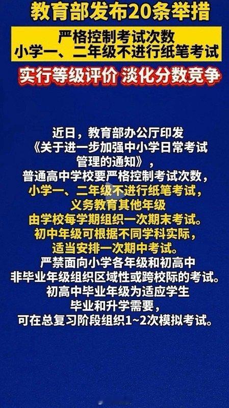 教育部发布最新通知,主要有四条:1、以后小学一二年级不进行纸笔考试。2、严禁向任何组织和个人购买试卷。3、高中要严格控制考试次数,不准举办各类联考,三天两头考。4、义务教育日常考试结果实行等级评价,考试结果不排名不公布。作为家有小学生的家长,看到这四条真是松了口气。以前一二年级的娃,书包里塞着各种单元卷、周考卷,晚上写作业能写到九点多,家长在旁边看着都心疼——这么小的孩子,哪需要这么多“实战演练”?现在明确不纸笔考试,至少能把这些额外的卷子拦在门外。高中的娃更不容易,三天两头联考,卷子堆成山,孩子熬夜刷题,家长跟着焦虑。这次严控考试次数,既给学生留了消化知识的时间,也让老师能更针对性地教学,挺好。最戳我的是“不排名不公布”。以前班级群里偷偷传成绩排名,家长们表面说“不在意”,私下都盯着自家娃的位置。现在政策一卡,能少点攀比,多关注孩子的实际进步,这才是教育该有的样子。当然,关键还得看落实。希望学校别打折扣,老师别变相加码,把减负真正落到孩子的书包里、书桌上、睡眠时间里。毕竟,教育不是“卷”出来的,是“长”出来的。