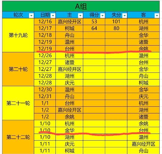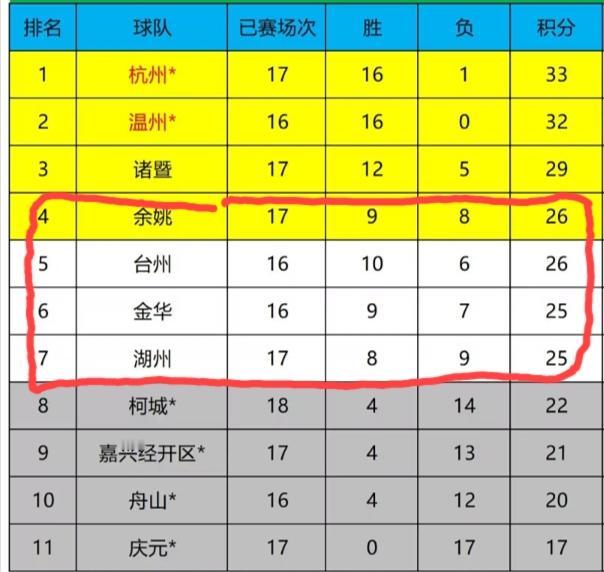 浙ba淘汰赛名额实际上只剩下一个名额了!其他七个名额被以下几个球队夺得: A组:杭州、温州、诸暨 B组:富阳、丽水、苍南、永康。(嘉兴仅剩理论上的可能了,今晚之后可能就彻底没有可能了,因为今天嘉兴要客场打富阳)。 觊觎A组最后一个名额的还有四个球队:余姚、台州、金华、湖州。 而接下去的赛程显示:台州的难度最大,余姚、金华的难度次之,目前积分落后的湖州最轻松。而12月19日台州vs余姚、1月10日金华vs台州的比赛结果至关重要。 所以谁能拿到最后一张门票真的还不好说! 大家觉得哪支球队最终能杀出重围?