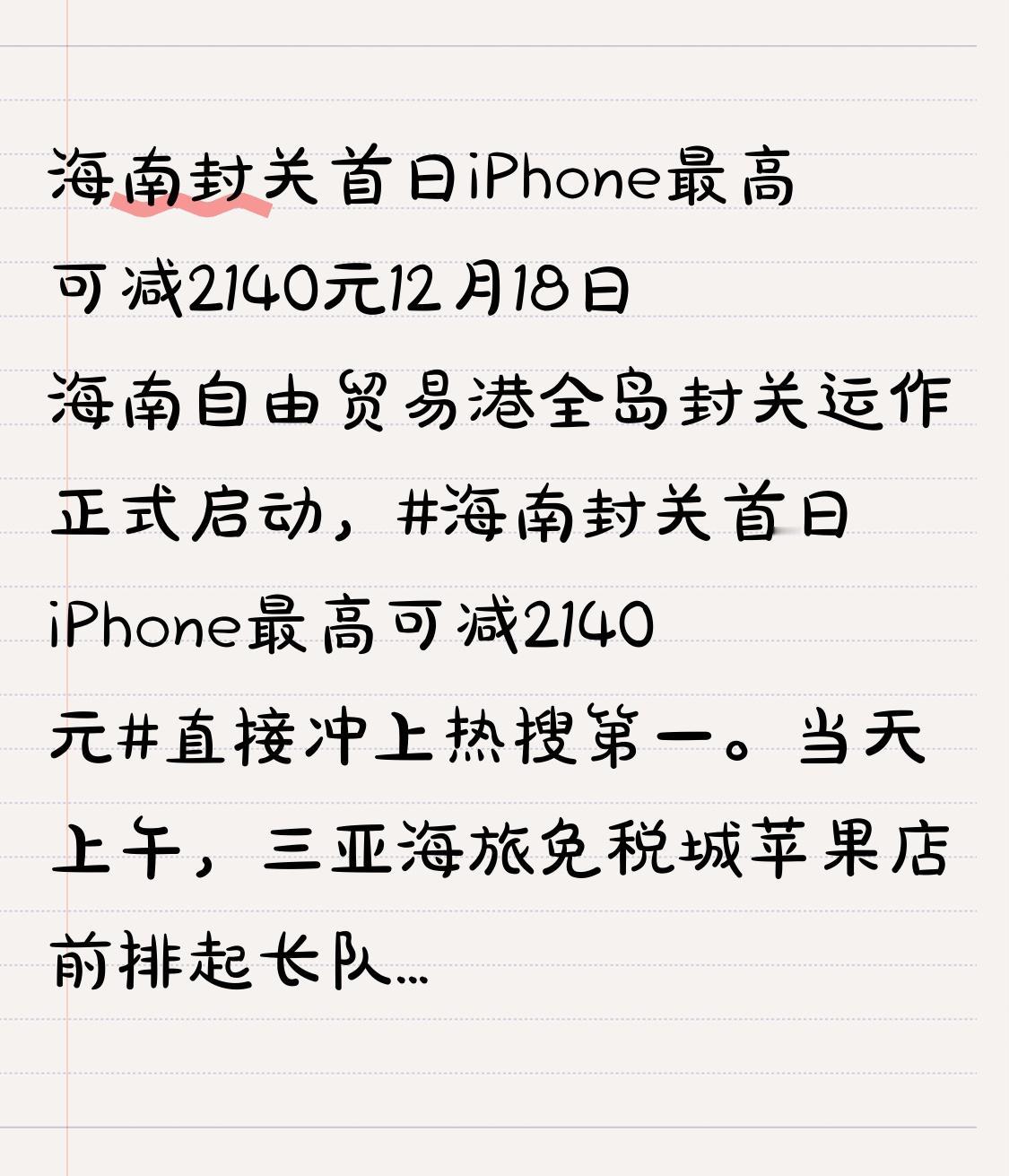海南封关首日iPhone最高可减2140元 12月18日海南自由贸易港全岛封关运作正式启动,海南封关首日iPhone最高可减2140元直接冲上热搜第一。当天上午,三亚海旅免税城苹果店前排起长队。 像iPhone 17 Pro Max 256GB版本,免税价9299元,比电商平台旗舰店便宜700元;iPhone 17 pro 256GB版本免税价8299元,也比旗舰店便宜700元。而iPhone 17 256GB版本优惠小点,差价420元。此外,免税苹果产品虽不能用国家补贴,但能叠加政府免税消费券,优惠力度更大。这封关福利,让到海南“买买买”变得更有吸引力了。