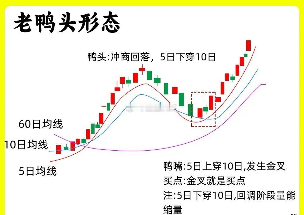 注意了!这个一个在上涨趋势里,最为强势的一种形态,而且他出现概率是比较大,一旦出现,往往我都会去关注一起。今天我就把这个模型的要点和大家分享清楚,只要你认真看完,那怕新手小白也能轻松看懂还是老规矩,点赞收藏或评论888支持一下,老韭每天分享炒股干货,以免以后想温习找不到了1.股价必须是处于一个上涨趋势里,60日均线处于多头趋势,斜率向上,这个是基础2.股价经过第一波的上涨以后,5日均线和10日均线开始回落,当时在60日均线上方,开始止跌向上,这就是老鸭头的鸭颈位置,这是主力洗盘行为。3.股价开始止跌向上,突破前期高点,形成阶段性高点,这就形成老鸭头顶部,这是主力测试上方抛压的手法。如果此时的抛压比较小,成交量比较温和,那就说明此时的主力已经控盘4.股价再次开始回落,当时此时的回调往往下跌都不会很大,当5日均线和10日均线再次出现金叉,说明主力开始发力,这就是鸭嘴,也是一个我们需要关注的位置。在整个走势里,往往是股价低位整体是抬高,整理趋势向上的,股价沿着5日均线和10日均线运行。下方我准备了老鸭头的案例图,建议要点和案例一起看,方便大家记忆。希望对大家有启发和帮助