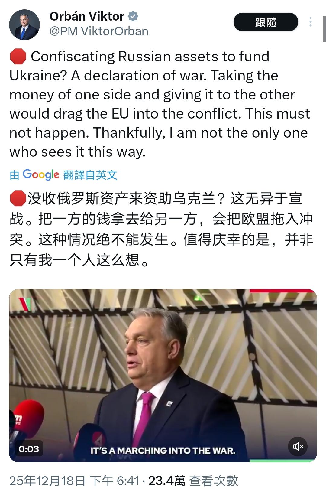 欧尔班硬刚欧盟:动俄资产必遭报应! 匈牙利总理欧尔班最近直接撂下狠话:欧盟想动用俄罗斯冻结资产援乌,无异于公开宣战,必然遭到俄方报复!这番表态也让欧洲内部的分歧彻底摆上台面,阵营划分清晰明了: 支持方:德国(默茨)、法国(马克龙)、波兰,以及波罗的海三国(爱沙尼亚、拉脱维亚、立陶宛)、北欧五国,明确倾向用俄冻结资产援助乌克兰。 反对方:匈牙利(欧尔班)、斯洛伐克(菲佐)、比利时(德韦弗)是核心力量,后续意大利、保加利亚、马耳他、捷克也加入阵营,坚决反对直接动用俄资产——比利时尤其顾虑,毕竟欧盟90%被冻结俄资产由当地的欧洲清算银行掌控,怕引火烧身。 真能感受到欧尔班的无奈,要成天跟这群被意识形态绑架的伪善者共事,太难了! 欧尔班的底气绝非空穴来风:他既懂普京、懂俄罗斯的反制实力,更精通欧盟法律和“一致同意”的决策机制。从纯法律和机制层面看,他的反对理由几乎无懈可击——未经主权国家同意处置资产,本身就违反国际法,还会彻底动摇欧盟的制度根基。 反观那些叫嚣着要没收俄资产的国家,大多是被历史恐惧裹挟,或是冷战幽灵未散,根本站不住法理和道理的脚跟。别忘了,俄罗斯可不是阿富汗,任人随意拿捏,真要敢动这些资产,后果绝对不是欧洲能扛住的! 最新进展是,反对阵营已经形成“阻断性少数”,欧盟相关方案很难推进。不得不说,欧尔班这波判断,确实精准又清醒。 Source: X