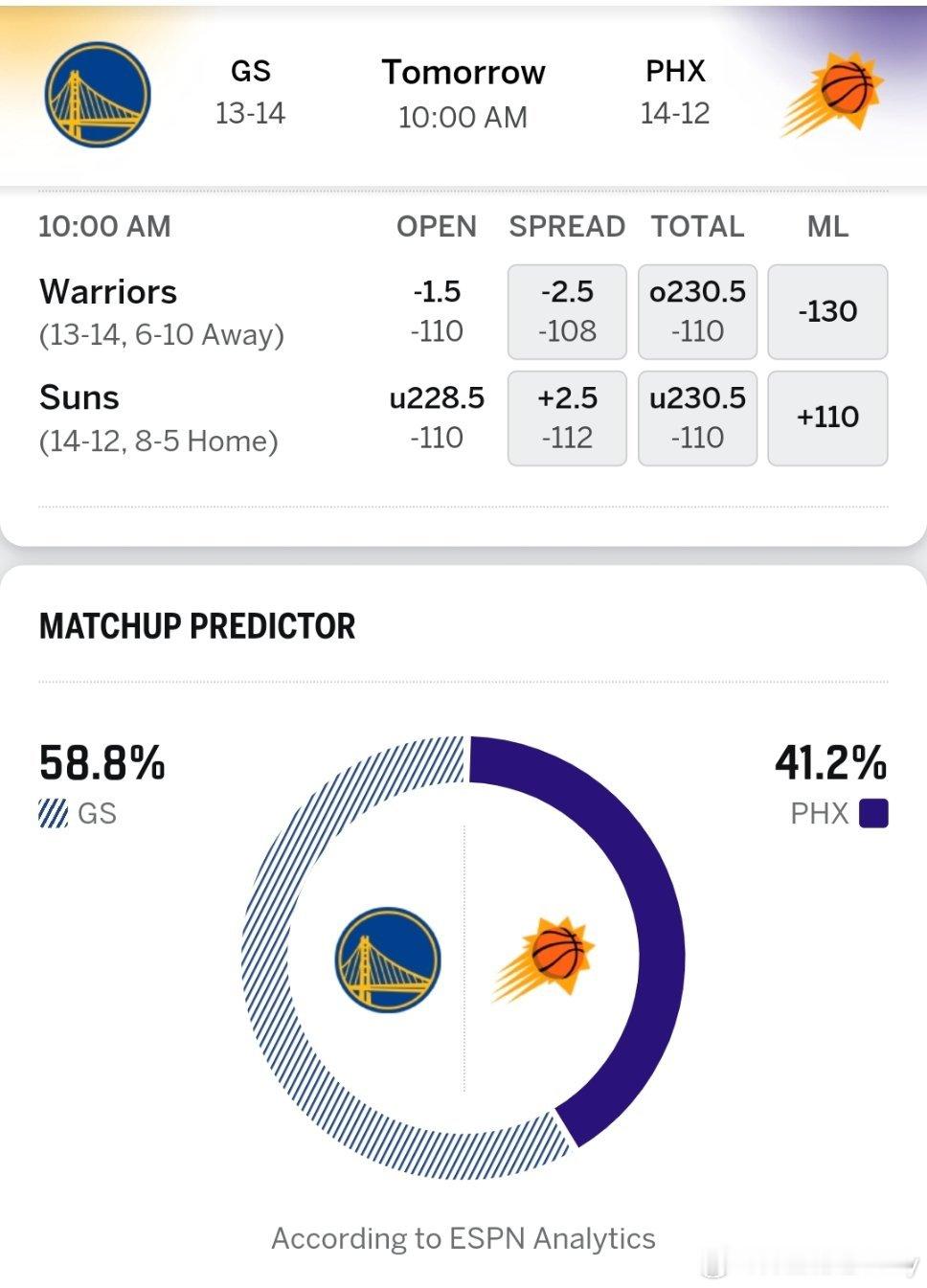 比赛预告:明天上午10点整勇士客场战太阳。双方战绩分列西部第7.8,仅相差1.5胜场。且接下来连战两场,等于是一场抵两场的战斗!!妥妥卡位战!🤔勇士伤病报告:霍福德、斯潘塞缺席太阳伤病报告:格雷森阿伦出战成疑,杰伦格林、利弗斯布雷亚缺席ESPN预测双方胜率:勇士58.8%,太阳41.2%,勇士-2.5分