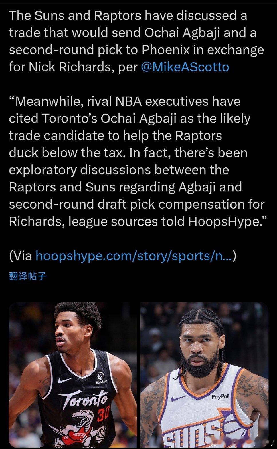 Michael Scotto:太阳和猛龙已讨论过一笔潜在交易,方案为猛龙将阿巴基+1次轮签,换取太阳队的理查兹。联盟多位竞争对手高管指出,猛龙方面很可能会将阿巴基作为交易人选,以帮助球队避免触发奢侈税。