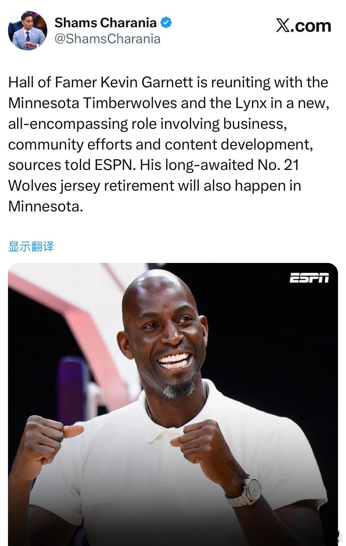 Shams:加内特将以一项涵盖商务运营、社区活动及内容创作的职务,重返森林狼与山
