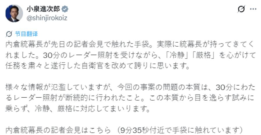 小泉进次郎干了一件“奇葩”的事情,昨天(12月17日),小泉进次郎把被“雷达照射”的F-15战机的飞行员所戴的手套拿出来展示,并在上面写上“冷静”、“严格”四个字。他说,我为那些在接受30分钟雷达照射的同时,仍能保持“冷静”、“严格”,并沉着完成任务的飞行员感到自豪。 12月17日,日本小泉进次郎在记者面前摆出一副很严肃、甚至带着悲壮的表情,但这次他秀的不是新武器,也不是航母模型,而是一双旧手套,连年份都看不出来。 他在手套上郑重写下“冷静”“严格”四个大字,乍一看,这一幕充满温情,好像是对飞行员的关怀,但仔细一拆,这双漂亮字眼的手套,其实不过是一块用来遮掩技术差距和政治算计的遮羞布。 要理解这出戏的前因得从12月6日说起,那天,冲绳东南公海发生的事情,被日本防卫省描述得像恐怖片,统合幕僚长内仓浩昭,一个出身飞行员的人,用“奔赴地狱”形容F-15飞行员的遭遇。 肾上腺素瞬间飙升,在高强度规避机动下,身体承受巨大的过载,日本方面强调,这种经历往往需要几个月心理干预。 然而,真正令飞行员深感“如坠地狱”的,并非告警器的聒噪之音,而是背后的技术鸿沟,中方歼 - 15两次锁定日机,锁定距离分别达52公里与148公里。 对F-15J来说,148公里已经是超视距打击范围,这意味着日本飞行员在完全看不见对手的情况下,脑袋上就像顶着一把上膛的枪,面对载有源相控阵雷达的全方位压制,所谓的“冷静”“严格”,只不过是掩盖真实战栗的伪装。 有意思的是,日本政客在这事上反应完全是政治操作,而不是技术反思,他们没有反思自己为什么要去中方航母附近挑衅,而是急着把飞行员的“悲情剧本”拿出来润色。 回头看看这出公关戏码的节奏,事情发生在12月6日,手套亮相却等到17日,整整等了11天,这不是敬意,而是救火,日本内阁支持率一路下滑,甚至还闹出官员“跪地密谋”的丑闻,把民众注意力转移到“可怜又坚强”的飞行员身上,无疑是一笔政治买卖。 此般手法,不禁令人忆起安倍晋三拉票的时候,身着迷彩、登上战车之作秀行为,如今,硬邦邦的战车换成软绵绵的手套,本质未改,军事人员依旧沦为政治舞台的背景板。 更讽刺的是,日本在类似问题上双标极明显,记得2016年夏天,日本F-15战机主动开启火控雷达锁定中方苏-30,那时日本政府轻描淡写称之为“正常侦察”,可这一次,风水轮流转,他们成了被锁定的一方,立刻大喊“严重挑衅”“危险行为”,吃亏就喊犯规,这逻辑在国际上没说服力。 小泉最近忙得不可开交,不仅打电话给美国防长哭诉,还拉着英国国防大臣开视频会,他想把手套上的悲情故事卖给全世界,博取国际同情,为右翼扩军添柴,但现实是冰冷的,G7、北约盟友大多只是礼节性敷衍。 中方这边手里有实打实的飞行轨迹和录音证据,而日方除了那双旧手套和几个漂亮字,没有半点硬核证据,用“冷静”掩盖惊慌,用“严格”粉饰挑衅,小泉这场“手套秀”,最终暴露的不是英雄主义,而是日本在军事对抗中力不从心的焦虑,以及在法理和道义上捉襟见肘的窘态。