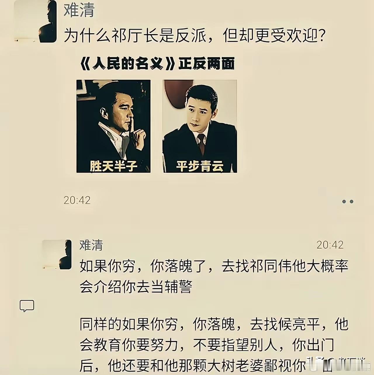 热门电视剧人民的名义当中,祁厅长是反派角色,检察官侯亮平是正派角色,但是看完整部电视剧,对祁厅长同情的人居多,受到许多观众的欢迎和认可,这是为什么?对于普通老百姓而言,为什么祁厅长更受大家的欢迎?因为当你落难时,你去找祁厅长,他会给你找一个看门的工作,但是如果你去找侯亮平,他只会把你赶出来,让你自己要努力,要争气因为祁厅长更接地气,更有人情味。只要不违反规定,祁厅长总会帮助前来有求于他的人,但是侯亮平总会拿出这样那样的规定,把你拒之门外。面对两个截然相反的人,作为普通老百姓,你会更喜欢谁呢!