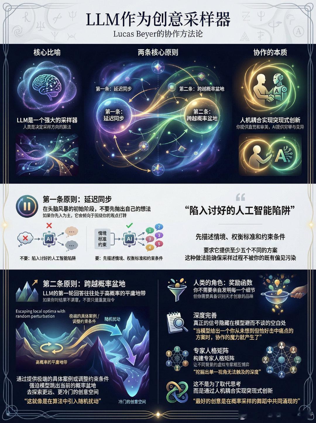 将大语言模型(LLM)视为头脑风暴的工具,本质上是在进行一场关于创意概率空间的探索。Lucas Beyer分享了一套极具启发性的协作方法论,将人类的角色从单纯的提问者转变为采样算法的引导者。在创意的概率版图中,LLM是一个强大的采样器,而人类则是决定采样方向的算法。第一条核心原则是延迟同步。在头脑风暴的初始阶段,不要先抛出自己的想法。LLM具有天生的顺从性,如果你先入为主,它会倾向于围绕你的观点打转,陷入讨好型的人工智能陷阱。正确的做法是先描述情境、权衡标准和约束条件,要求它提供至少五个不同的方案。这种做法能确保采样过程不被你的既有偏见所污染。第二条原则是跨越概率盆地。LLM的第一轮回答往往处于高概率的平庸地带。如果你对结果不满意,不要只是重复指令,而要通过提供极端的具体案例或调整约束条件,强迫模型跳出当前的概率盆地,去探索那些更远、更冷门的创意空间。这就像是在算法中引入随机扰动,帮助系统逃离局部最优解。人类在这一过程中的角色是奖励函数。你不需要亲自发明每一个细节,但你需要具备识别天才创意的品味。当模型给出一个你从未想到但恰好击中痛点的方案时,协作的魔力就产生了。这是一种互补的进化:LLM思考人类容易忽略的模式,人类过滤LLM产生的幻觉与平庸。深度思考者们进一步完善了这个框架。有人提出,真正的信号往往隐藏在模型避而不谈的空白处;也有人建议在进入LLM空间之前,先在纸上完成原始创意的孵化,以防被模型的平庸共识所同化。更进阶的玩法是构建专家人格矩阵,让不同背景的虚拟专家在对话中相互博弈,从而挖掘出单一视角无法触及的深度。最终,这种协作不是为了让AI取代思考,而是通过人机耦合,实现一种突现式的创新。你提供直觉和审美,AI提供穷举与变异。最好的创意往往不是由谁独立发明的,而是在这场概率采样的舞蹈中共同涌现的。x.com/giffmana/status/2001371097090957469