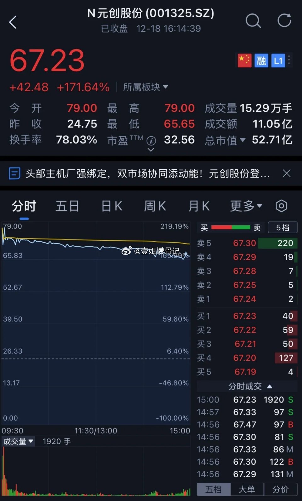 今天上市的这个新股也算是大肉签!今天上市的深交所主板股票元创股份开盘便大涨219.19%,然而开盘便是最高价,随后便开始震荡下行,截止收盘,元创股份大涨171.64%。元创股份是一家专业从事研发、生产、销售橡胶履带类产品的企业,主要产品最终应用于农业生产、工程施工等不同应用场景。公司凭借过硬的技术能力和产品质量,国内市占率靠前。如果按照中一签500股计算,如果开盘价卖出的话最高可赚27125元。如果收盘价卖出的话仍可赚21240元。虽然元创股份收益没有像摩尔线程和沐曦股份那样亮眼,但是元创股份表现也同样不错。各位友友们,你们中签各位友友们,你们中签元创股份了吗?你们都卖出了吗?是什么价位卖出的呢?