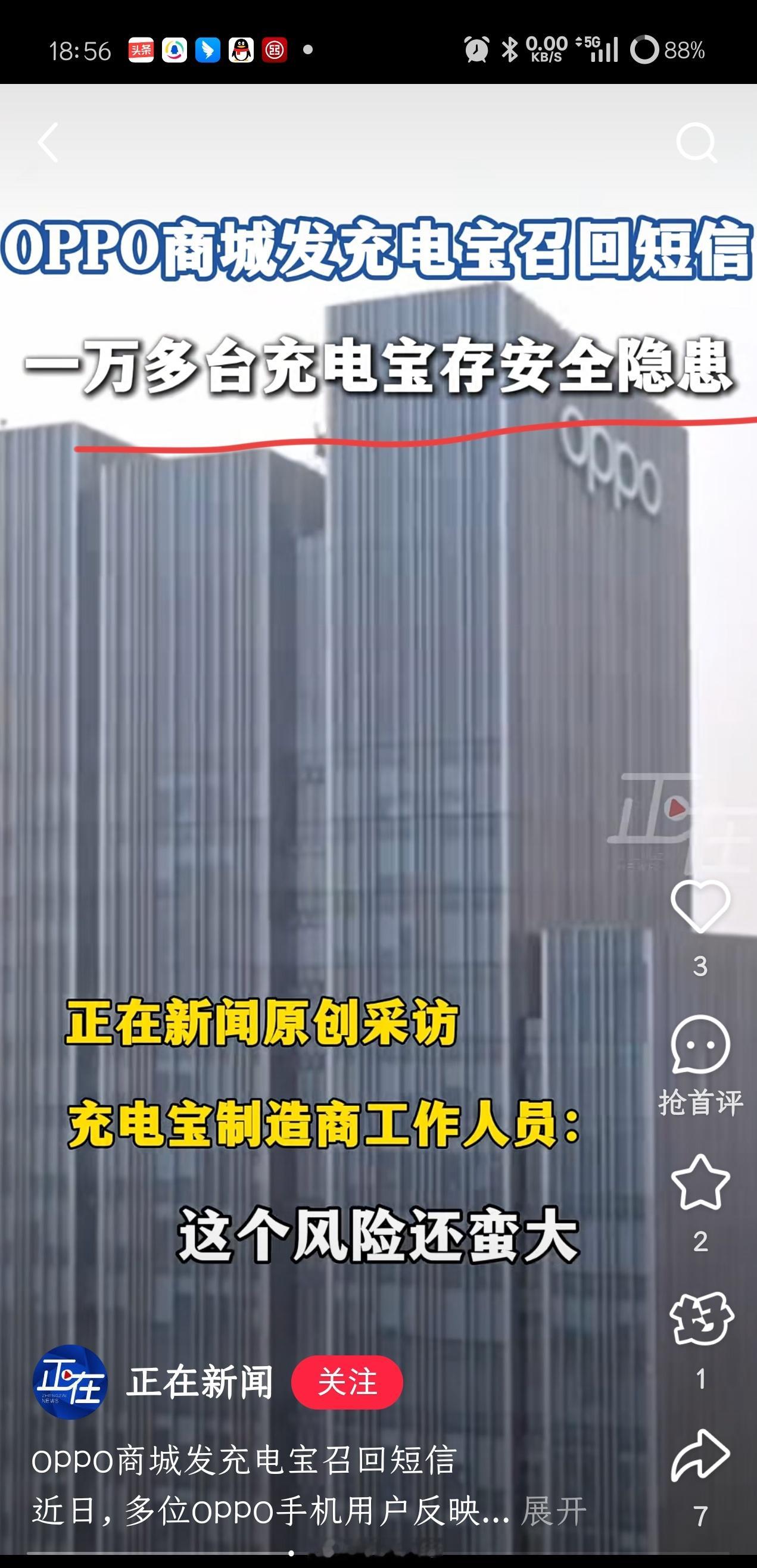 啊?正在新闻报道:OPPO商城发充电宝召回短信,1万多台充电宝存安全隐患