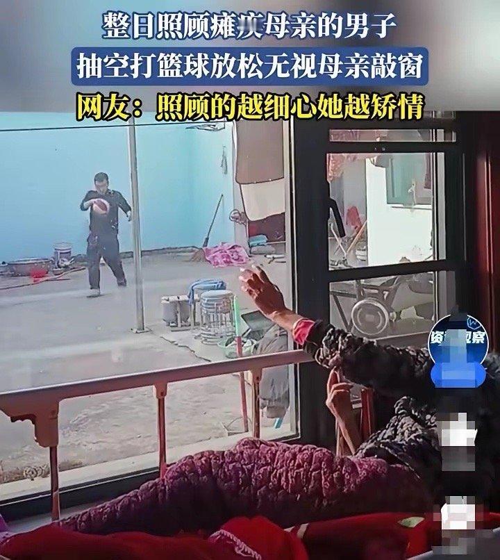 男子今年已经40多岁,为了照顾瘫痪在床的母亲,一直没有结婚,也没有固定的工作,抽空去打一会儿篮球放松一下,母亲又开始敲窗让他过来!每时每刻都要儿子陪在身边,有时候一个小时要喝五六次水,喝完水又要上厕所,母亲体重近150斤,男子体重110斤,每次上厕所都要费很大的劲!给母亲戴尿不湿,有时候神智不清的她,直接把尿不湿撕了,直接尿床上,大小便经常失禁!亲戚朋友都在夸男子孝顺,说男子这辈子是来还债的!刚开始照顾母亲的时候,男子状态饱满,脸上有光!如今十几年过去了,男子的气色黯淡无光!几乎每天24小时都在照顾母亲,母亲吃饭没有规律,睡觉没有规律,现在开始有一些痴呆,经常傻笑!这样的日子对于儿子来说虽然艰难,迷茫!但是别无选择!真心祝愿天下的父母都能健康平安!