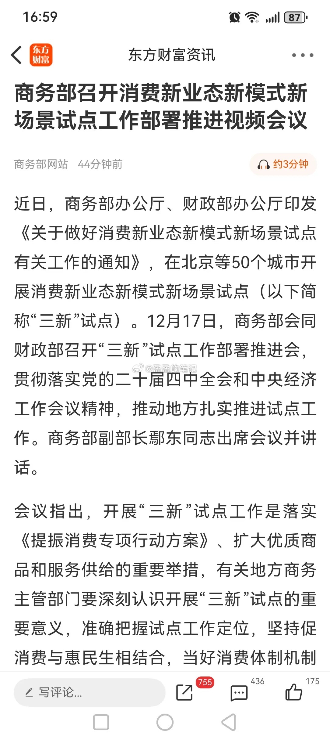 盘后传来三大重要消息,或影响明天A股相关走势。消息一,据报道,商务部于近日召开了消费新业态新模式新场景试点工作部署推进会议。该会议深刻阐明了如何使消费与普惠民生相结合的意义。有助于使消费政策更好的落实到实处,从而更好地推动相关消费 。消息二,今日港股三大指数涨跌不一,其中恒生科技指数下跌0.73%。恒生科技指数最近表现一般,或影响A股相关个股的表现。消息三,西餐药业发布公告,拟低于1.7亿且不超过2亿人民币回购公司股票。公司用真金白银回购自家公司股份,有利于提升投资者信心。对此你们怎么看?
