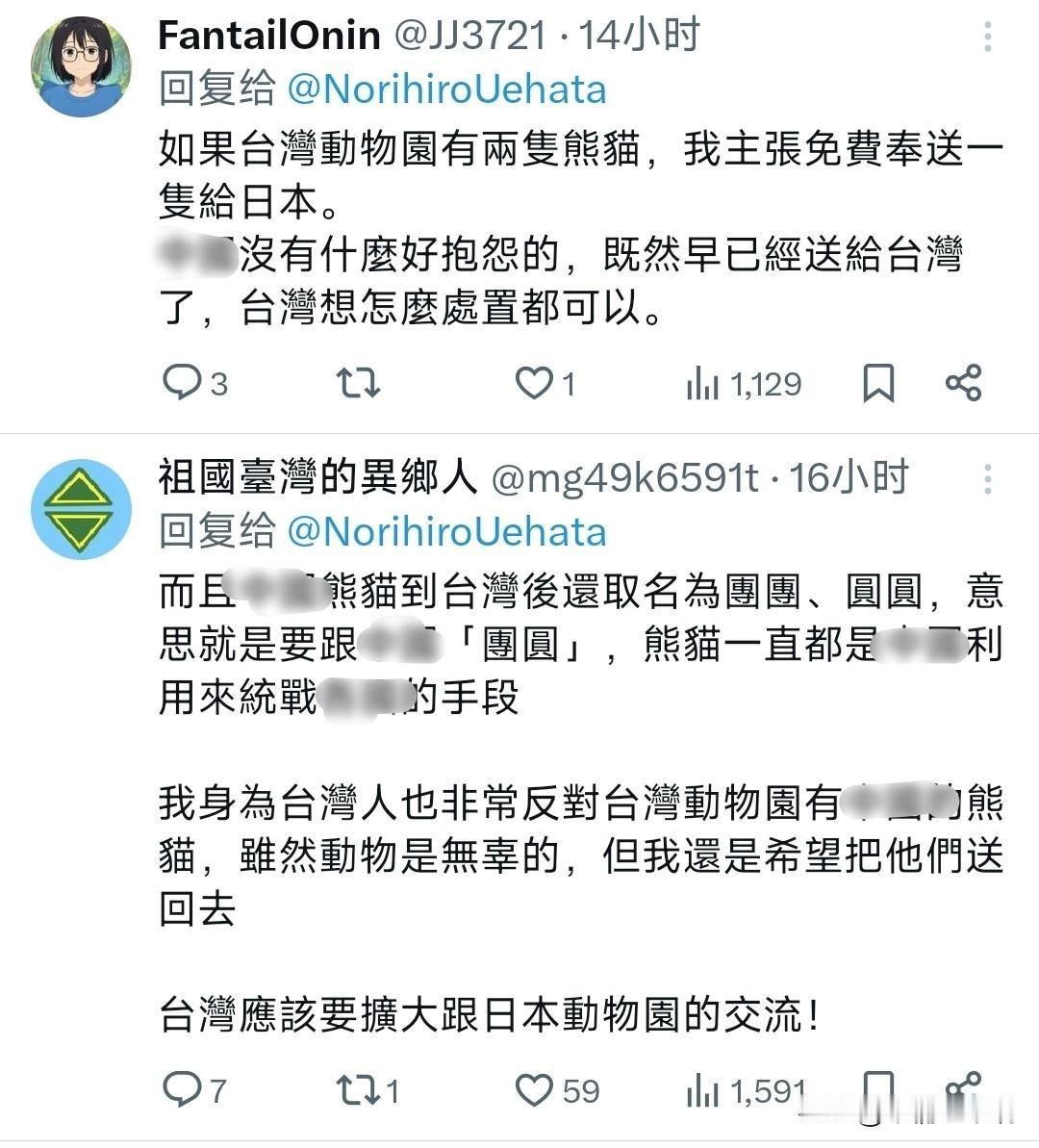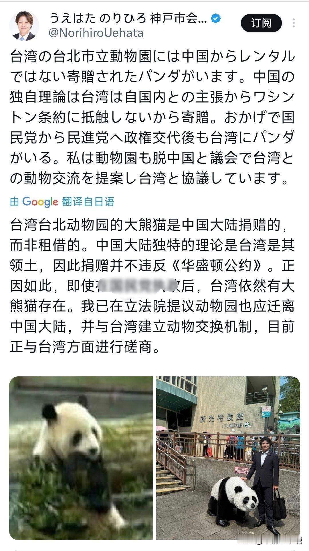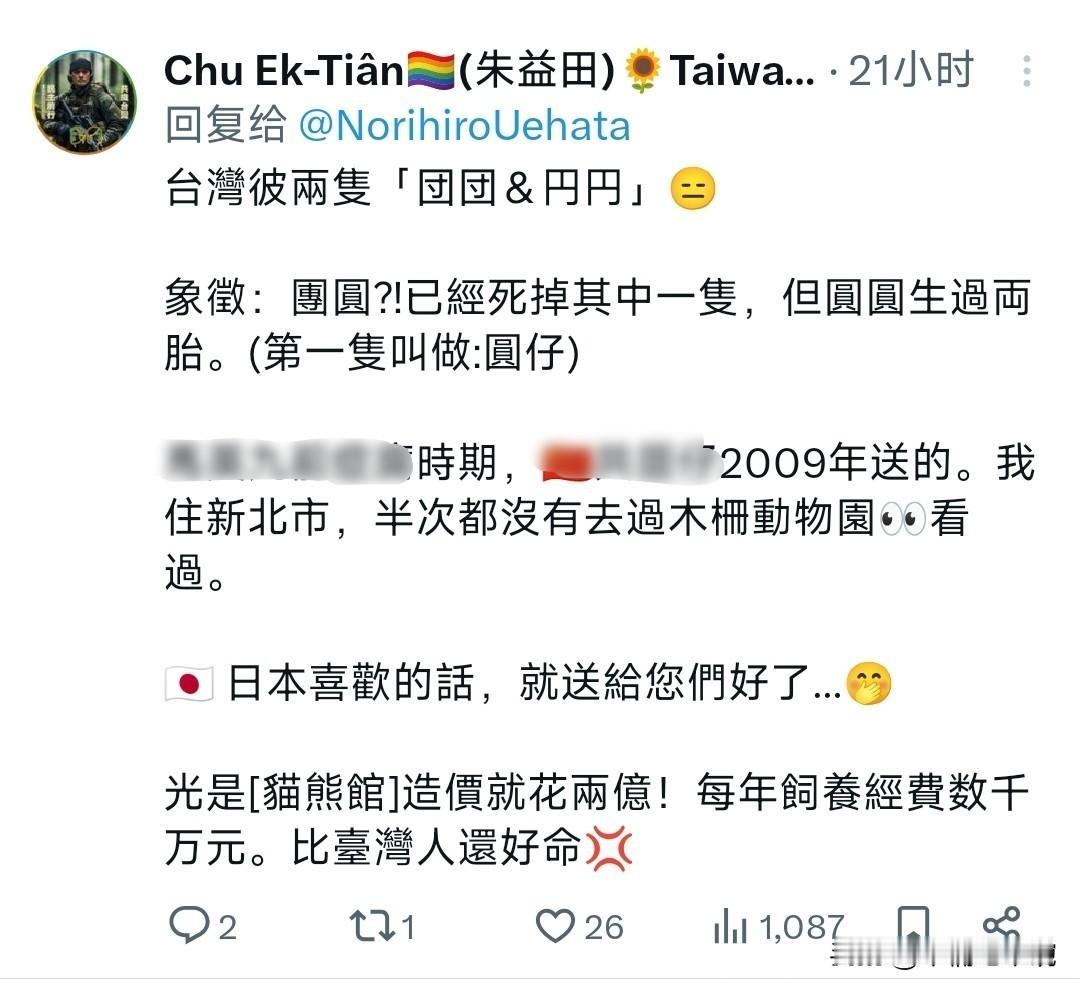 恬不知耻,日本要求台岛赠送大熊猫,“独派”回应“想要就拿走” 当地时间16日,日本神户市议员上畠寛弘在社媒上用中日双语发帖称,台湾岛内的台北动物园里的大熊猫是中国大陆捐赠而非租借的,这是因为台湾是中国的一部分,捐赠大熊猫不违反《华盛顿公约》。而由于日本即将迎来“0大熊猫”时代,因此,日方已经与台岛开始了磋商,希望可以与台岛建立“动物交换机制”,也就是要求台岛把大熊猫送给日本。 说白了,这就是一场日本揣着明白装糊涂的索取,配上“台独”分子卖岛求荣的闹剧,俩方一唱一和,把中国的主权当空气,把国宝当私产,要不是这事实在离谱,估计不少人都得以为是编出来的荒诞戏码。 先说说日本这边为啥突然盯上了台岛的大熊猫,原因很直接,他们马上就要进入“0大熊猫”时代了。 目前日本国内就剩东京上野动物园的“晓晓”和“蕾蕾”两只大熊猫,按照中日双方的协议,这对龙凤胎得在2026年1月下旬归还中国,到时候日本境内就彻底没大熊猫的身影了。 要知道大熊猫在日本的热度可不是一般的高,单是“晓晓”和“蕾蕾”一年就能给上野地区带来超过300亿日元的经济效益,周边文具、饰品、玩偶等几百种相关商品常年热销。 现在要失去这只“摇钱树”兼“国民萌宠”,日本民众舍不得,政客们更急着找补,只是他们没想着好好跟中国沟通续租,反倒把歪心思打到了中国台湾地区头上。 神户市议员上畠寛弘在社媒上发的中日双语帖子,看似承认“台湾是中国的一部分”,说捐赠不违反《华盛顿公约》,实则根本没安好心,就是想借着这个由头,把台岛当成独立的“交换主体”,搞所谓的“动物交换机制”,本质上还是在打“以台制华”的算盘。 更让人无语的是岛内“台独”分子的反应,不仅没人反驳这种分裂倾向的磋商,反而有人公然附和,说什么“那边送给我们的熊猫就是我们的了,怎样都无所谓,您想要就拿走”。 还有人更直白地表示,“只要日本人开口,应该能轻松从赖清德手里拿到熊猫”,这种毫无底线的嘴脸,着实让人作呕。 这些“台独”分子怕是忘了,台北动物园里的“团团”“圆圆”以及它们的后代“圆仔”“圆宝”,从来都不是台湾能随意处置的私产。 2005年大陆宣布向台湾同胞赠送一对大熊猫,经过上亿观众票选命名为“团团”“圆圆”,寓意着两岸团圆的美好期许,这对大熊猫的赴台之路并不顺畅,受当时政治因素影响多次受阻,直到2008年才正式抵达台北动物园。 为了迎接它们,台北动物园虽然斥资打造了专业场馆,但从遴选、体检到后续的饲养技术支持,全程都有大陆的参与和保障,本质上这是大陆送给台湾同胞的情谊载体,核心前提就是台湾是中国不可分割的一部分。 作为中国领土的一部分,台湾根本没有任何主权性质的权力,别说把大熊猫赠送给日本,就连擅自处置的资格都没有。 而且关于大熊猫的相关权责,早就有明确的约定,不是“台独”分子一句“是我们的了”就能篡改的,那些说“想要就拿走”的人,根本没搞清楚状况,也无视两岸同胞对“团团”“圆圆”的深厚情感。 当初“团团”生病时,两岸专家还曾联手救治,这份跨越海峡的温情,在“台独”分子眼里竟然成了可以随意交易的筹码。 其实明眼人都能看出来,日本政客的这个提议根本站不住脚,讨论送熊猫这件事本身就是外行话。 大熊猫作为中国的国宝,其所有权和处置权始终归中国所有,任何绕过大陆、试图与台岛进行熊猫“交换”的行为,都是对中国主权的侵犯,也不可能得到国际社会的承认。 更何况当前中日关系因日方的一系列挑衅行为陷入紧张,原本的熊猫租借合作基础已经受损,这种时候打台岛熊猫的主意,更是错上加错。 最后必须说一句,以上仅为个人看法,对于日本的无理要求和“台独”分子的荒唐回应,你怎么看?欢迎在评论区留下你的观点。