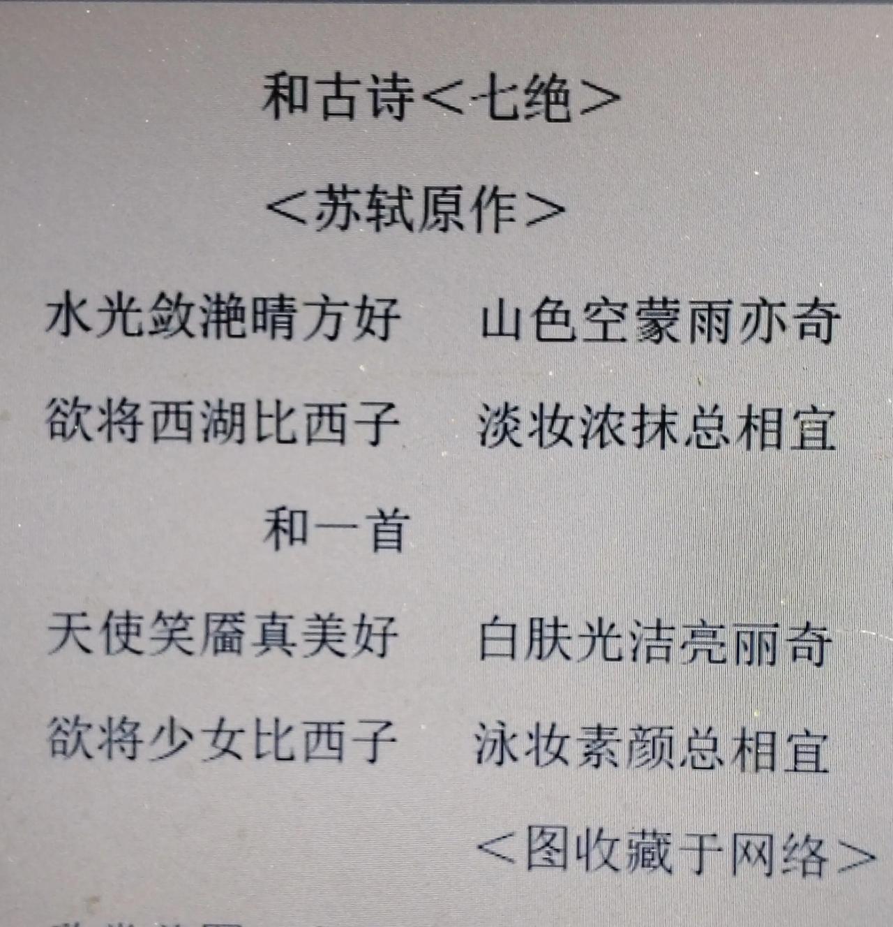 苏轼原作 水光敛滟晴方好,山色空蒙雨亦奇。 欲将西湖比西子,浓妆淡抹总相宜。 和一首 天使笑靥真美好,白肤光洁亮丽奇。 欲将少女比西子,泳装素颜总相宜。
