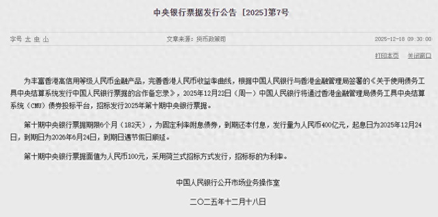 据中国人民银行12月18日消息,为丰富香港高信用等级人民币金融产品,完善香港人民币收益率曲线,根据中国人民银行与香港金融管理局签署的《关于使用债务工具中央结算系统发行中国人民银行票据的合作备忘录》,2025年12月22日(周一)中国人民银行将通过香港金融管理局债务工具中央结算系统(CMU)债券投标平台,招标发行2025年第十期中央银行票据。