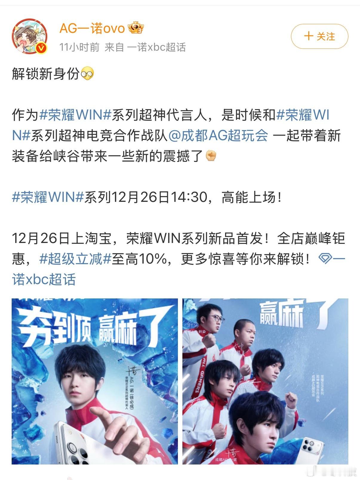 荣耀WIN官宣AG一诺合作荣耀也太会选代言人了,顶级操作配合荣耀WIN的强大性能,这对组合有点帅。而且目前淘宝首发享超级立减,至高10%优惠。期待一波后续的王炸体验。