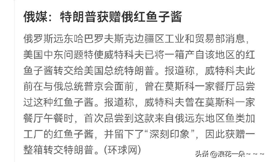 可以啊,恩!特朗普可以呀![鼓掌] 特朗普得到了俄罗斯极品特产——红鱼子酱。这可是好东西啊,可不是黑鱼子酱,这红鱼子酱生长在远东地区,都是在极寒冷的海域里面生长的,营养价值极高,大补啊。这普通人想吃上野生的红鱼子酱,知道有多难吗?特朗普真有口福,不过他的特使威特科夫真有心啊!这礼物一送,俄乌冲突变和平,特朗普又得出大力。[捂脸]