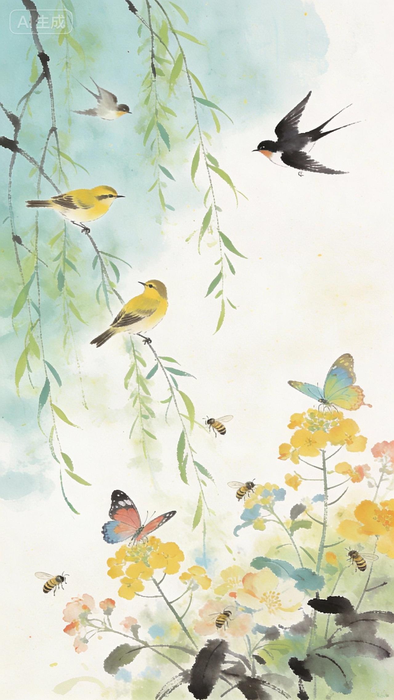 上联:蝶舞蜂飞春意闹 下联:燕语莺啼晓风柔