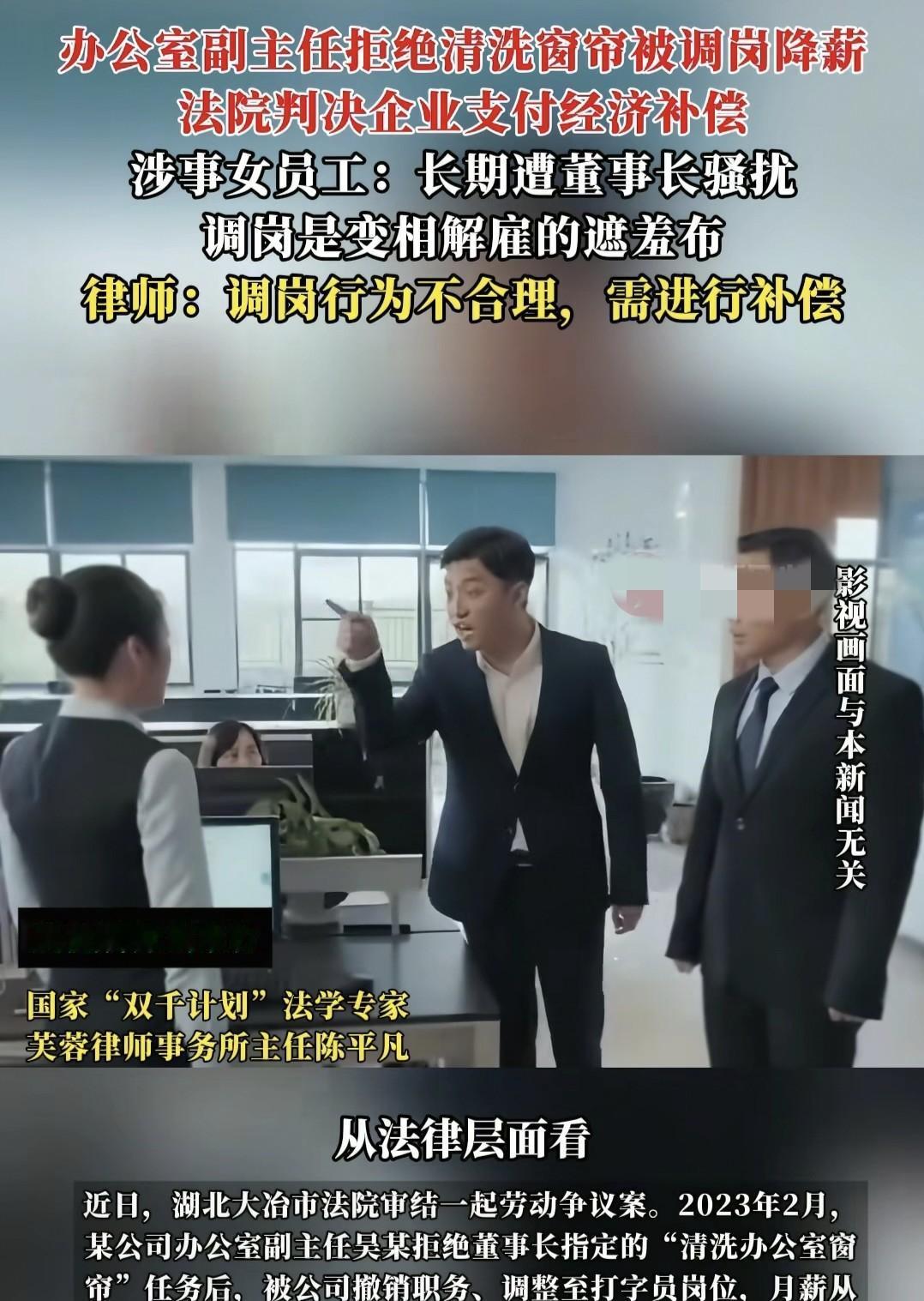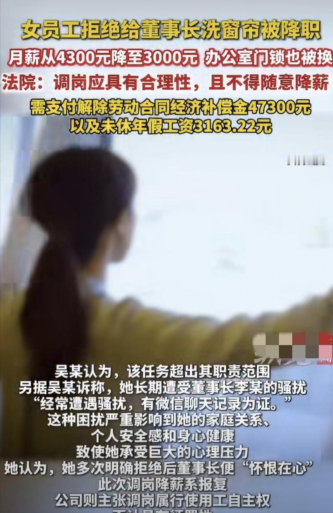 “色欲熏心?”湖北大冶,办公室副主任吴某,因拒绝给董事长洗窗帘,直接被降成打字员,工资从4300元砍到3000元,办公室门锁被换,还火速招了新人顶替。 看似是“不服从安排”的小事,背后却是职场权力霸凌和性骚扰的烂摊子。 吴某在这家公司干了整整11年,从普通员工一步步熬到办公室副主任,手里管着行政大小事,算是公司的老资历了。可自从董事长李某盯上她,日子就没安生过。 李某经常给她发暧昧露骨的骚扰信息,吴某一开始还想着顾全大局,委婉拒绝,可对方根本不收敛,反而变本加厉。 次数多了,吴某只能直接硬刚,表示“请保持工作距离”,两人的关系也彻底闹僵。 2023年2月,李某突然打了个电话给吴某,语气命令式的:“你过来把我办公室的窗帘洗了。” 吴某当场就懵了——公司明明有专门的保洁人员,清洗窗帘是保洁的本职工作,自己一个行政副主任,管的是流程协调、事务统筹,怎么也轮不到干这种活。 她想都没想就拒绝了:“这不是我的工作范围,找保洁处理。”可谁能想到,这一句拒绝,直接点燃了李某的报复欲。 2月2日,公司开了个会,没提前跟吴某沟通,就宣布撤销她的副主任职务;2月9日,又紧接着发通知,把她调到打字员岗位,工资一下子降了1300元。 更过分的是,公司趁她不在,偷偷换了她原办公室的门锁,让她连自己的东西都拿不出来。 还火速招聘新人接手她的工作,给她下了最后通牒:三天内必须到打字员岗位报到,否则按旷工算,旷工三天直接按自动离职处理。 吴某心里跟明镜似的,这哪里是调岗,分明是逼着自己主动走人,她多次找公司要说法,要求正式解除劳动合同,可公司始终拖着不答复,就想让她“自愿离职”,省一笔赔偿金。 被逼到绝境的吴某,没选择忍气吞声。她收集好所有证据,先申请了劳动仲裁,仲裁没达到预期,又一纸诉状把公司告上了法庭,要求确认公司违法解除劳动合同,支付经济补偿金和工资差额。 法庭上,公司还在嘴硬,说这是“行使管理自主权”,吴某不服从工作安排,调岗降薪合情合理,甚至辩称新岗位工资“基本相当”。 可吴某直接甩出了关键证据——和董事长李某的微信聊天记录。里面清清楚楚记录着李某长期给她发的骚扰信息,以及她多次拒绝后,对方语气越来越差的对话。 她的律师也直接点破:“清洗窗帘根本不是吴某的岗位职责,公司紧接着搞调岗、降薪、换锁、招新人,一套组合拳下来,明摆着是报复性变相解雇。” 法院的判决说得很明白:公司确实有管理自主权,但不能滥用。单方降职降薪必须有合理性,而且得和员工协商。 清洗窗帘和吴某的岗位职责毫无关系,公司拿这个当理由处罚员工,已经违反了劳动合同法,属于“未按劳动合同约定提供劳动条件”。 最终,法院没有支持吴某“双倍赔偿金”的请求(理由是认定性骚扰的直接证据还不够充分),但确认了双方劳动关系在2023年2月就已解除。 公司需要支付两项费用:一是经济补偿金47300元(按吴某11年工龄算,每满一年给一个月工资,4300元×11个月正好是47300元);二是未休年假工资3163.22元,两项加起来一共50463.22元。 值得一提的是,虽然这是劳动争议案件,法院没直接认定性骚扰事实,但在判决书中明确提到:“性骚扰相关情节,对理解整个案件的来龙去脉至关重要,也能印证公司调岗行为的报复动机。” 这事儿给所有职场人提了个醒:老板的“管理权”不是尚方宝剑,不能想怎么来就怎么来。 劳动合同法里写得明明白白,要变更岗位、调整工资,必须和员工协商一致,还得留下书面记录,不能老板一句话就定了。像这种“故意安排和岗位职责无关的活,不做就报复”的操作,纯属违法。 再说说职场性骚扰,民法典第1010条早就有规定:违背他人意愿,以言语、文字、图像、肢体行为等方式实施性骚扰的,受害人有权请求行为人承担民事责任。 而且公司有义务防范职场性骚扰,要是员工因为拒绝骚扰被打击报复,公司不仅要赔工资、给补偿金,还可能面临更严重的法律责任,比如被劳动监察部门处罚,甚至影响企业声誉。 吴某能胜诉,关键就在于她留好了证据——微信聊天记录、公司的调岗通知、工资条、考勤记录,这些都是维权的“硬通货”。 遇到类似情况,千万别慌:首先要明确拒绝不合理要求,保留好所有沟通记录;然后可以向公司工会或劳动监察部门投诉;如果问题没解决,要在争议发生后1年内申请劳动仲裁;仲裁不满意,还能向法院起诉。 职场不是老板的“一言堂”,每个人都有被尊重的权利,不合理的工作安排可以拒绝,职场骚扰更不用忍,法律永远是劳动者最坚实的后盾。 参考信源: 拒洗窗帘被降职,员工杠上“霸道总裁” 2025-12-17 人民法院报