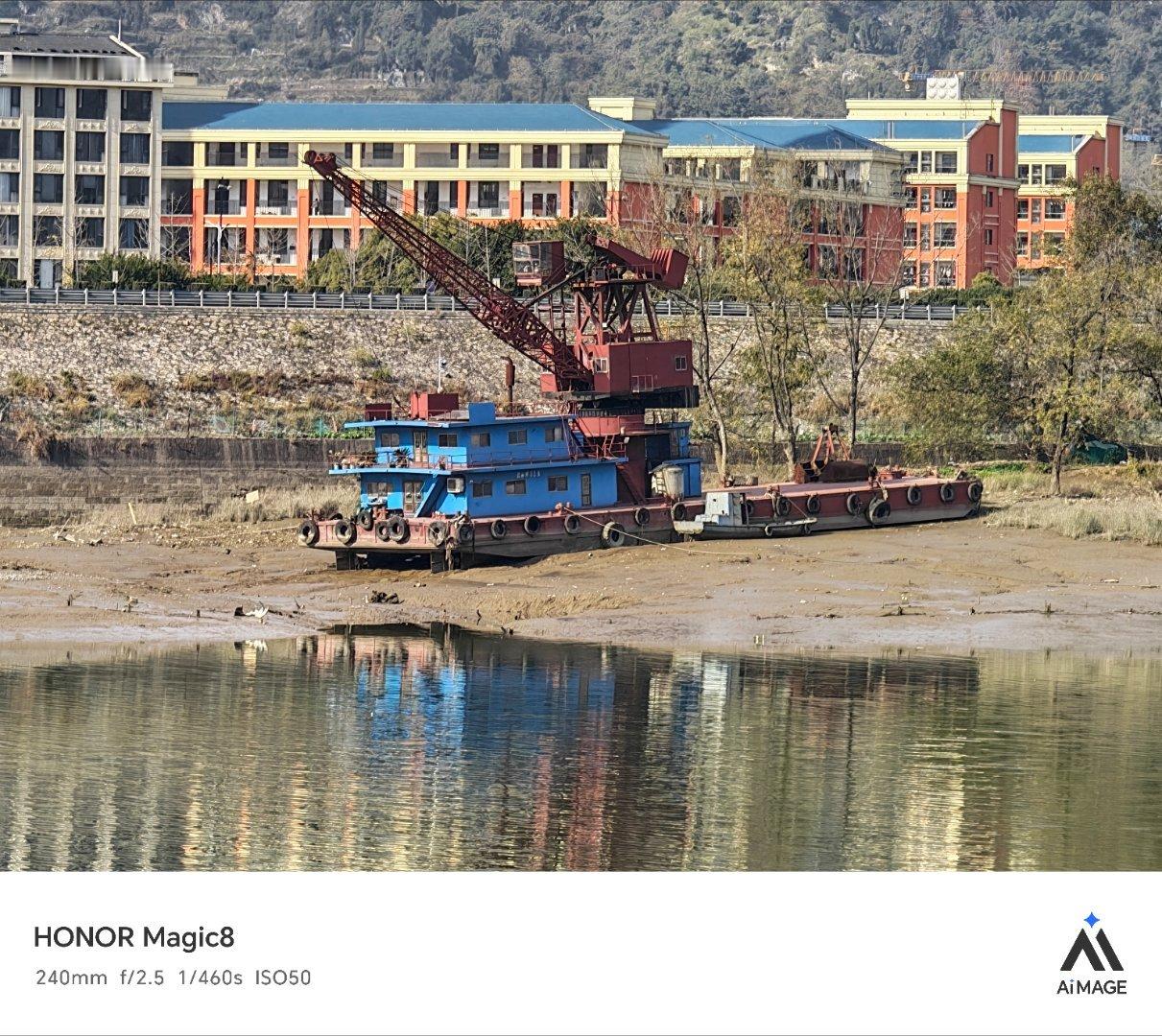 退潮后船只搁浅了。等涨潮后又能在水中游走。
