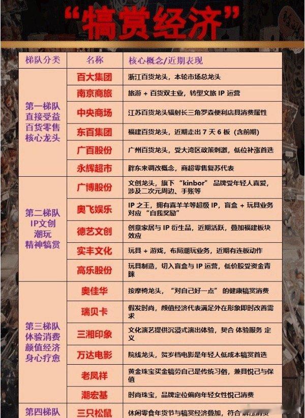 今天A股出了一个新题材:犒赏经济。看了下,大致指符合年轻人的消费,什么奶茶,盲盒、去旅游、听演唱会等等!当然还有硅胶、会,所洗脚以及套,头的丝,袜,今天也给炒起来了。大消费最近不断吹风,但房子、白酒、食品饮料,牛奶家电等老登消费,大家都不信。怎么办呢?给你换一个新故事,今天市场绕新兴名词“犒赏”,搞出了近20家涨停,就问你们服不服吧!总之,犒赏经济与去年“谷子经济”很像,炒的也是新零售、潮玩等小市值股票,业绩都烂的一批。正宗的也不炒,比如泡泡玛特、蜜雪冰城这些都是跌的,说明还是题材的玩法!现在年轻人不买房不买车不恋爱不结婚,刚需上精打细算,却愿为奶茶、演唱会、潮玩等非必需品付费。买个盲盒刺激一下感官,买个新出的奶茶暂时忘记烦恼,看个演唱会治愈下心情...总之就是便宜随意,一批时髦的东西!虽然这带动不了多少消费,但对消费股是好事,开始有故事可以讲了。我们大A的尿性,有故事才有人炒,消费主线位置可能要立起来了!