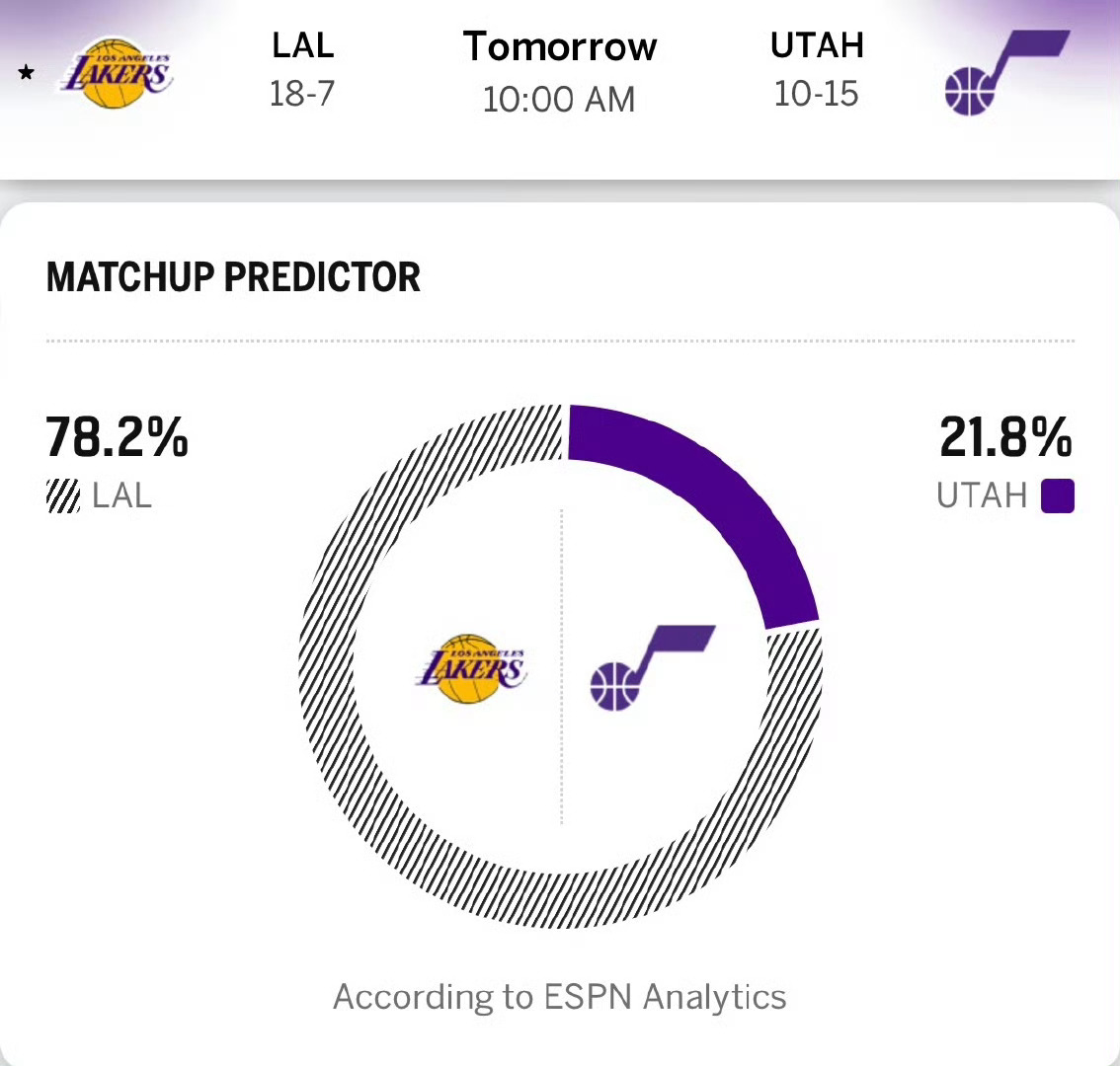 湖人明日客场10点对阵爵士,ESPN给出获胜概率:湖人78.2%、爵士21.8%。目前两队战绩:湖人近5场3胜2负,总战绩18胜7负西部第3!爵士近5场3胜2负,总战绩10胜15负西部第10!双方伤病情况:湖人——艾顿(左肘酸痛)里夫斯(左小腿拉伤)缺战。文森特出战成疑,可乐杯背伤继续缺席!爵士——马尔卡宁(腹股沟)有伤出战成疑,凯斯勒、尼昂因伤继续缺阵!双方球队数据对比:湖人进攻效率全联盟第7,防守效率全联盟第20!罚球效率全联盟第1,投篮命中率全联盟第2,场均失误全联盟第20!爵士进攻效率全联盟第22,防守效率全联盟第29!场均助攻全联盟第2,场均篮板全联盟第5!指数,爵士+7.5,看好爵士守住底线!湖人vs爵士