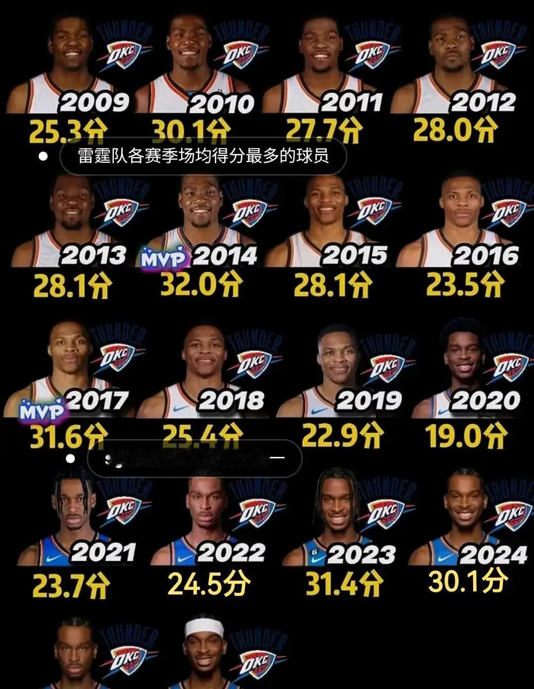 杜兰特在雷霆都没做到的事,亚历山大默默干了四年。 不是一场,不是一季,是连续四个赛季场均30分以上。数据不会骗人:杜兰特最长的连续30+是四个赛季,威少只有一个赛季,哈登在雷霆时期从未染指得分王。而亚历山大,带着54%的命中率,年复一年凿进禁区,场均内线得分比大多数中锋还高。 人们总怀念雷霆三少的天赋爆炸,却忽略了效率的残酷。杜兰特用无解干拔,威少靠暴力突破,而亚历山大融合两者,用最古典的中距离和最狡猾的欧洲步,交出了历史级的真实命中率。他身边没有MVP级别的队友,却把一支重建球队带到西部前三。 当讨论从“他像谁”变成“谁像他”,故事就变了。结尾句:他不是在追赶雷霆三少,他是在用更安静的脚步,丈量一条全新的、属于自己的山脊线。