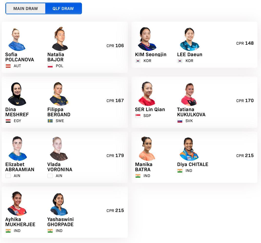 WTT球星挑战赛多哈站2026【女双参赛名单】比赛时间:1.13-1.18正赛:柳汉娜/金娜英🇰🇷,大藤沙月/横井咲樱🇯🇵,朱芊曦/申裕斌🇰🇷,石洵瑶/王晓彤🇨🇳,覃予萱/纵歌曼🇨🇳,陈熠/蒯曼🇨🇳,杜凯琹/吴咏琳🇭🇰,佐藤瞳/芝田沙季🇯🇵资格赛:波尔卡诺娃/巴乔🇵🇱,金成珍/李多恩🇰🇷,梅谢芙🇪🇬/博嘉德🇸🇪,舒麟茜🇸🇬/库库尔科娃🇸🇰,阿布拉米安/沃罗尼纳AIN,巴特拉/奇塔莱🇮🇳,A穆克吉/戈尔帕德🇮🇳