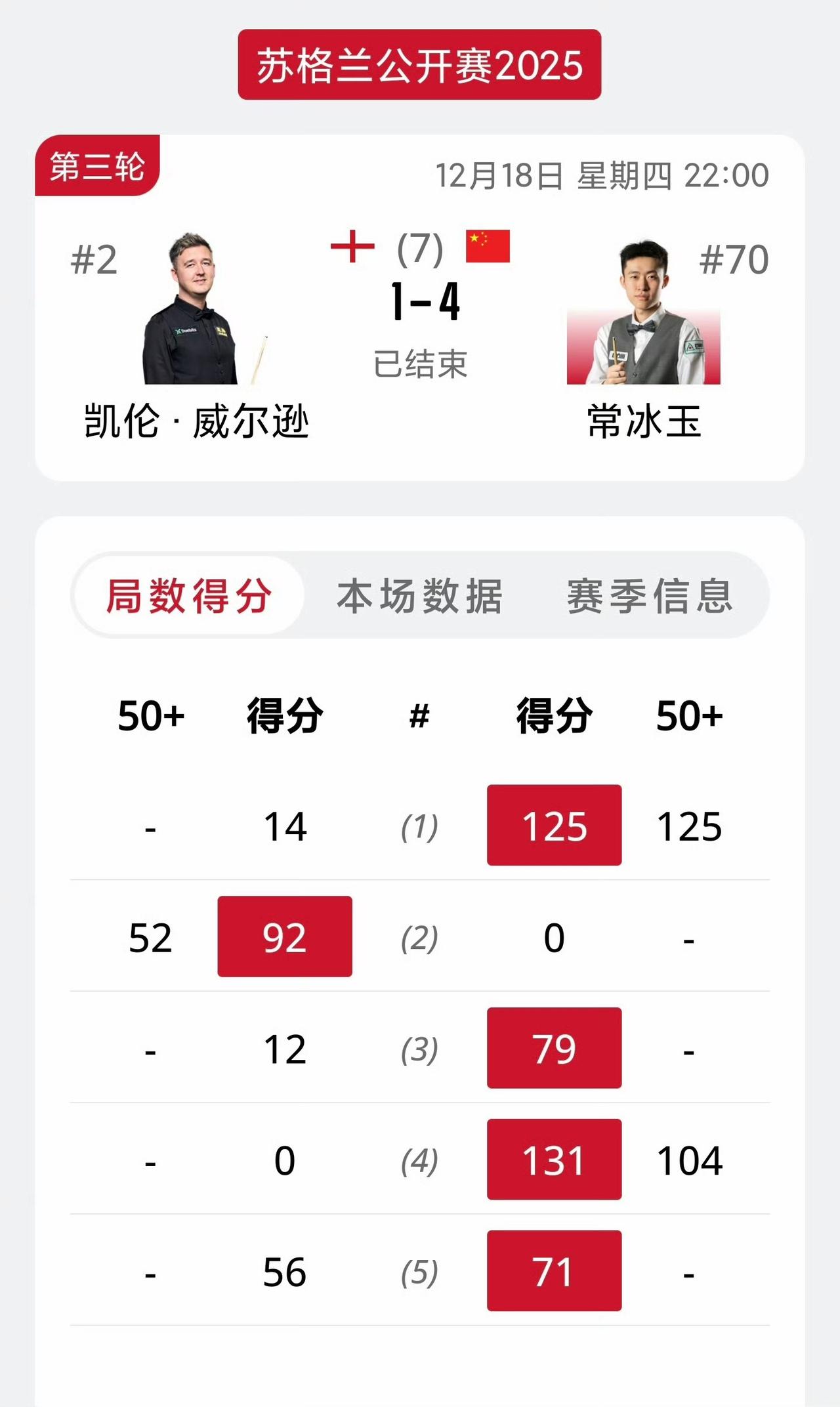 自从在英锦赛打出职业生涯首杆147后,常冰玉在本届苏格兰公开赛如破茧成蝶,击败强敌同时锁定世界大奖赛门票。他的优点就是“准”,一准天下无难事! 首轮:4-2马奎尔 次轮:4-1斯佳辉 16进8:4-1凯伦威尔逊