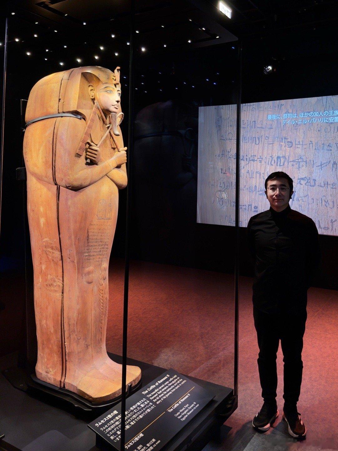 拉美西斯大王。东京都年度大展,地点在丰洲的Crevia Base Tokyo2025年3月8日至9月7日,东京展开古埃及拉美西斯主题展览。此展是埃及考古最高理事会办的,水平高,之前曾在美国休斯敦和法国巴黎举办,此次是首次在亚洲巡展,由东京市政府承办。由于票价高昂且广受欢迎,主办方发现举办时间太短了,于是延长到过年假期期间。拉美西斯二世是古埃及第十九王朝的第三位法老,统治时间长达67年,高寿96岁,是古埃及历史上最著名、影响力最大的法老之一。拉美西斯二世流下来很多文物,但他的墓早期就被盗过,木乃伊在古埃及时期被另存保留。图9是我和他的重藏木棺合影。这个展览以拉美西斯为名,但也是个晒宝展,能看到很多考古出土的古埃及金银珠宝,最典型的是第22王朝的舍顺克二世宝物,他的墓1939年被发现,没有被盗,里面有很多宝物,图5是我和舍顺克二世的金面具合影。宝物亲见,合影留念谢田看宝