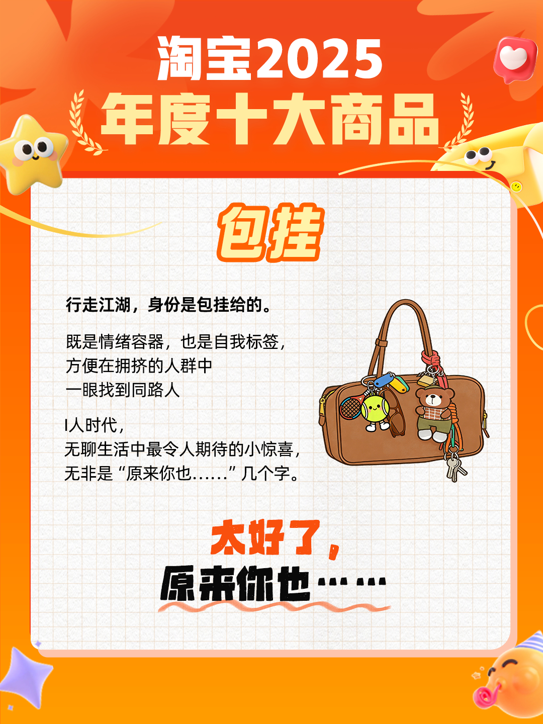 淘宝2025年度十大商品出炉,包挂堪称年度惊喜~这款看似小巧的包挂,实则是今年备受追捧的「行走风水局」!2025年为木火之年,包上悬挂的毛绒玩偶自带火属性,既为整年增添火热氛围,也传递出治愈感;它绝非单纯的装饰,更堪称行走的社交名片——背着动漫IP款式出门,极易在人群中识别出同好,开启趣味社交。既然2025年能靠它稳住运势,2026年更要以“挂”字当头,延续好运!出门在外,这款小巧物件便是撑场面的实用搭子~淘宝公布2025年度十大商品
