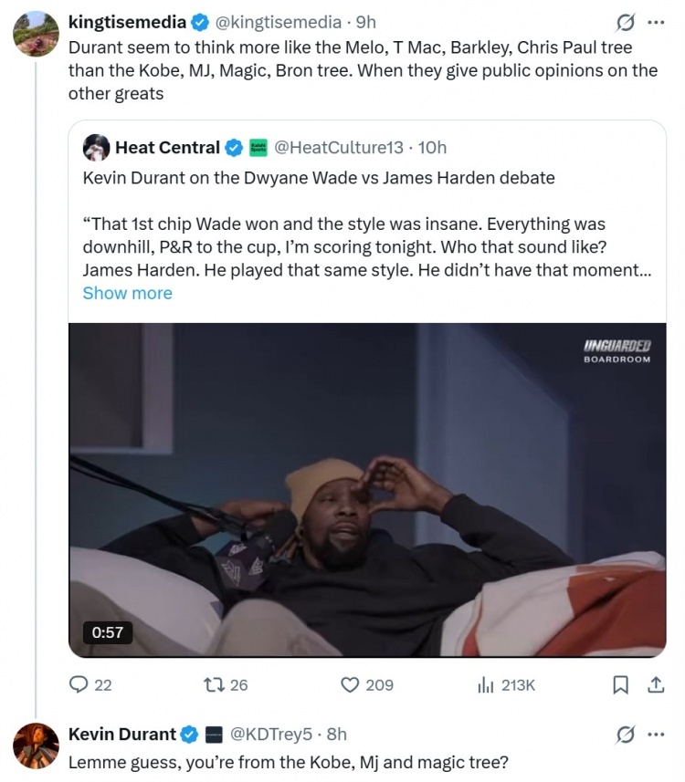 网友称杜兰特不是乔科詹那一档的!杜兰特回复:我猜你和他们是一档的?杜兰特谈自己的历史地位,表示他认为自己是历史最佳球员之一:“我不会在健身房投篮时说‘哦,我比伯德强,我比魔术师强,比乔丹强。’ 我并不那么在乎他们。我爱这些家伙。我觉得我在过去19年里所做的一切,就像MJ、科比、勒布朗一样,你不能说我还不足以与你们相提并论。”对此一网友评论道:“杜兰特似乎更倾向于像卡梅隆·安东尼、麦迪、巴克利和克里斯·保罗这样的球员,而不是科比、乔丹、魔术师约翰逊和勒布朗·詹姆斯这样的球员。当他们公开评价其他伟大运动员时。”杜兰特直接回复道:“ 让我猜猜,你是来自科比、乔丹和魔术师这一级别的吧?”