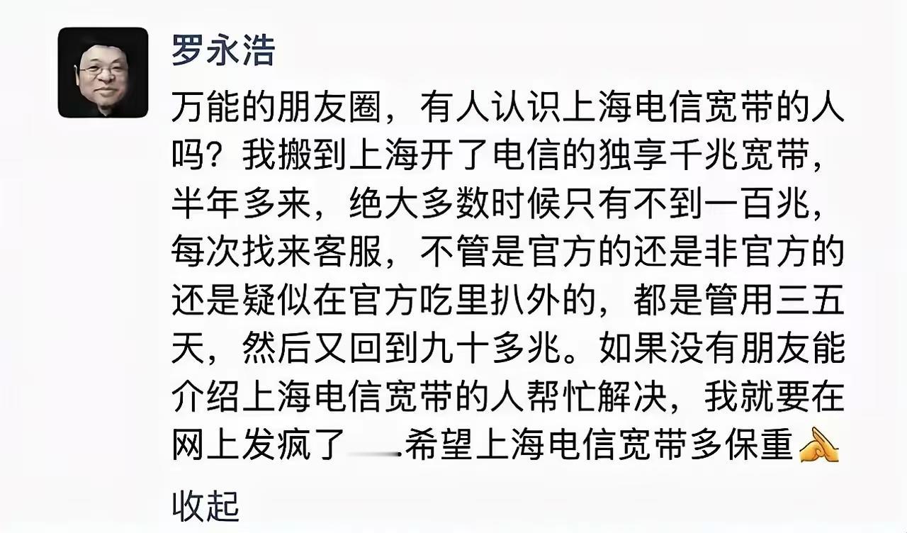 不得不说罗永浩真是一个制造话题的高手,昨天还在怼新东方俞敏洪,今天就又盯上了上海电信,真是一波未平一波又起。 这次呢不是在节目上说而是在朋友圈说,当然跟过去一样不出意外的又流了出来,此次他抱怨的是电信的独享千兆宽带。现在很多地方已经在推行千兆宽带,罗永浩搬到上海后也尝了尝鲜,不过体验糟糕。 据他所说号称千兆常常只能达到百兆的水平,打客服电话投诉又经常打不通,好不容易打通一次又只管用三五天,然后又变成百兆。于是他在朋友圈求助问有没有认识电信宽带的人帮忙解决,不然他就要在网上发疯[捂脸] 看来电信宽带的人今晚要睡不着觉了,从以往经验来看被他盯上的人或企业通常都没啥好下场,在这一点上你不得不佩服他。