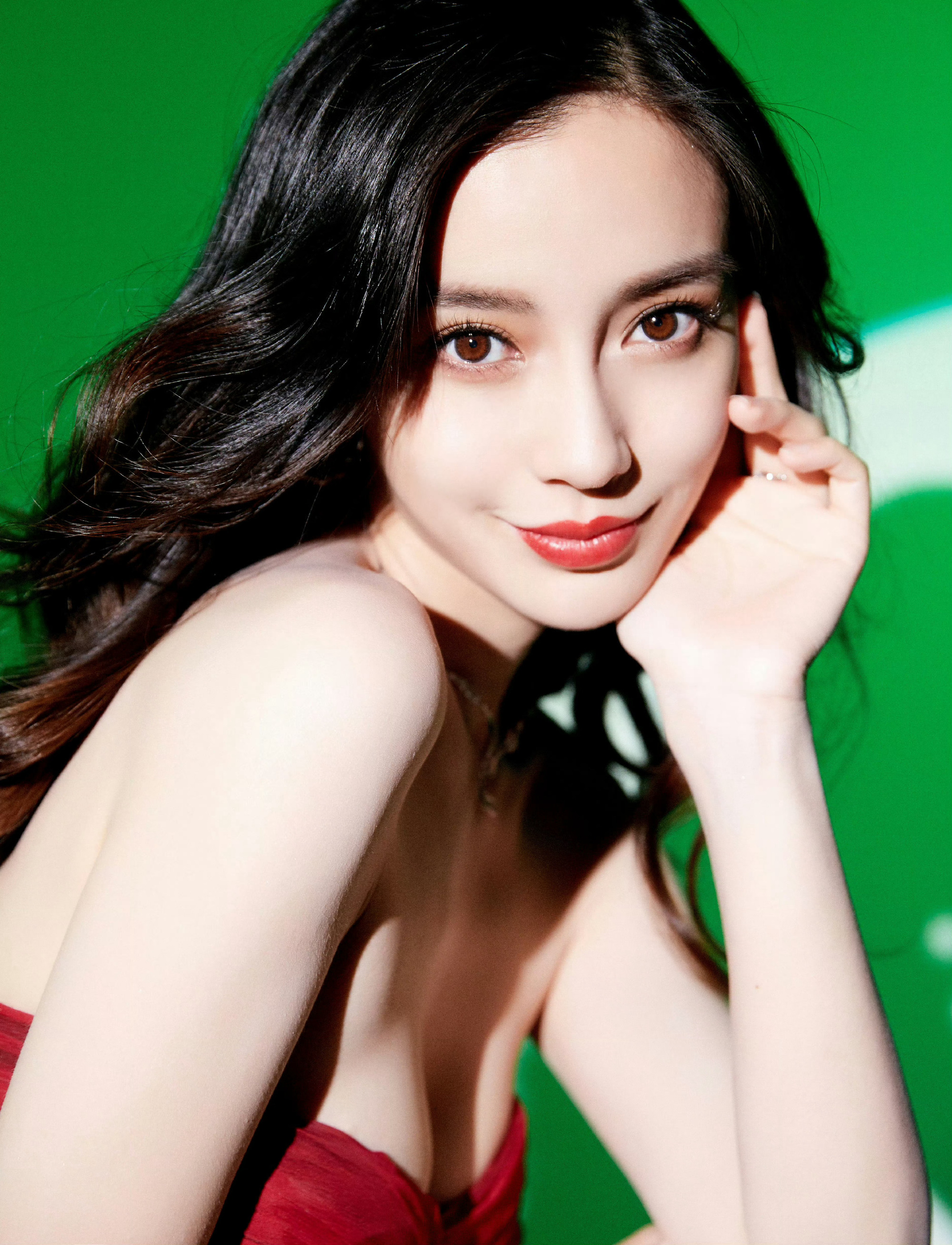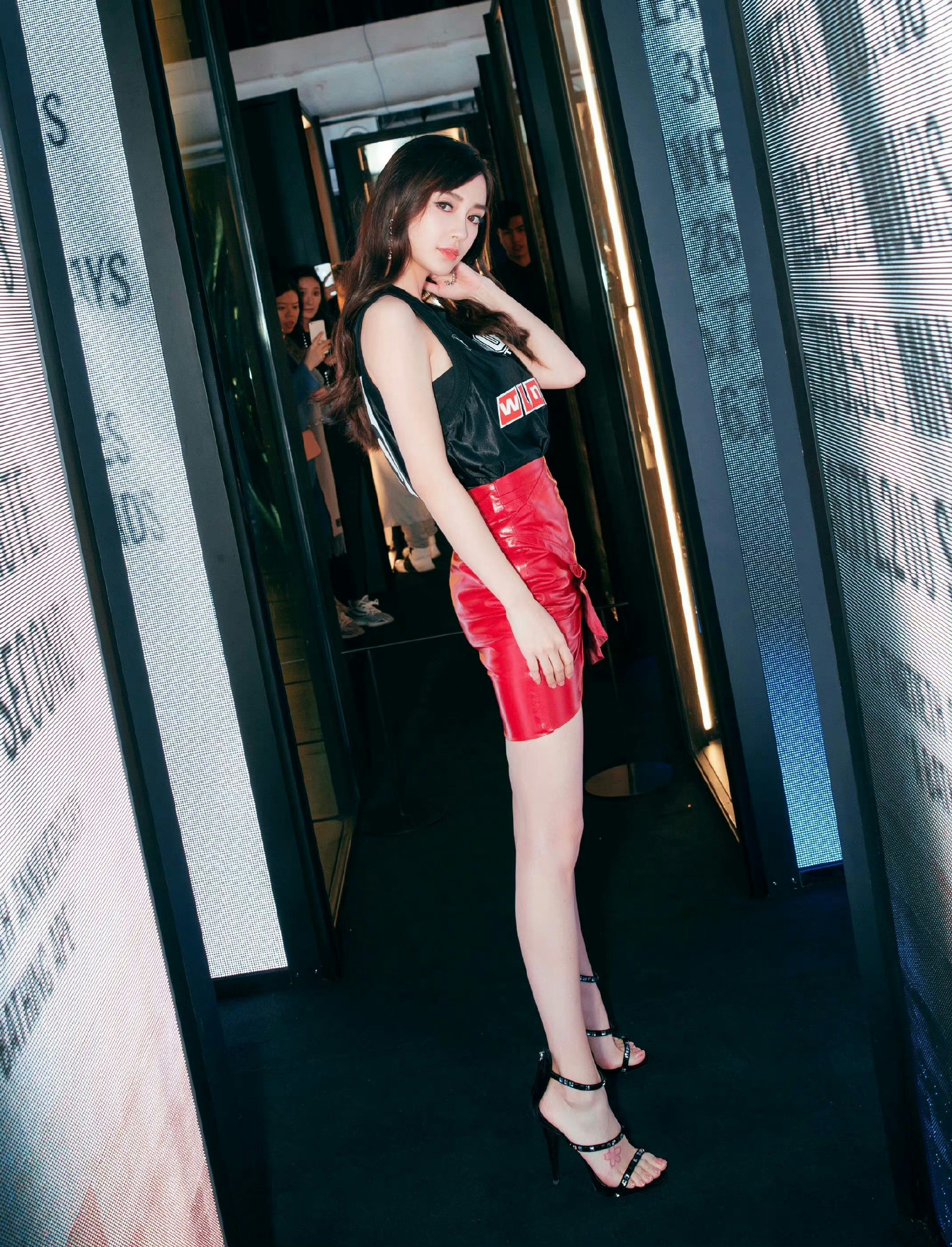 angelababy,卷发红裙子美腿妆造,清冷优雅姿态。杨颖angelababy