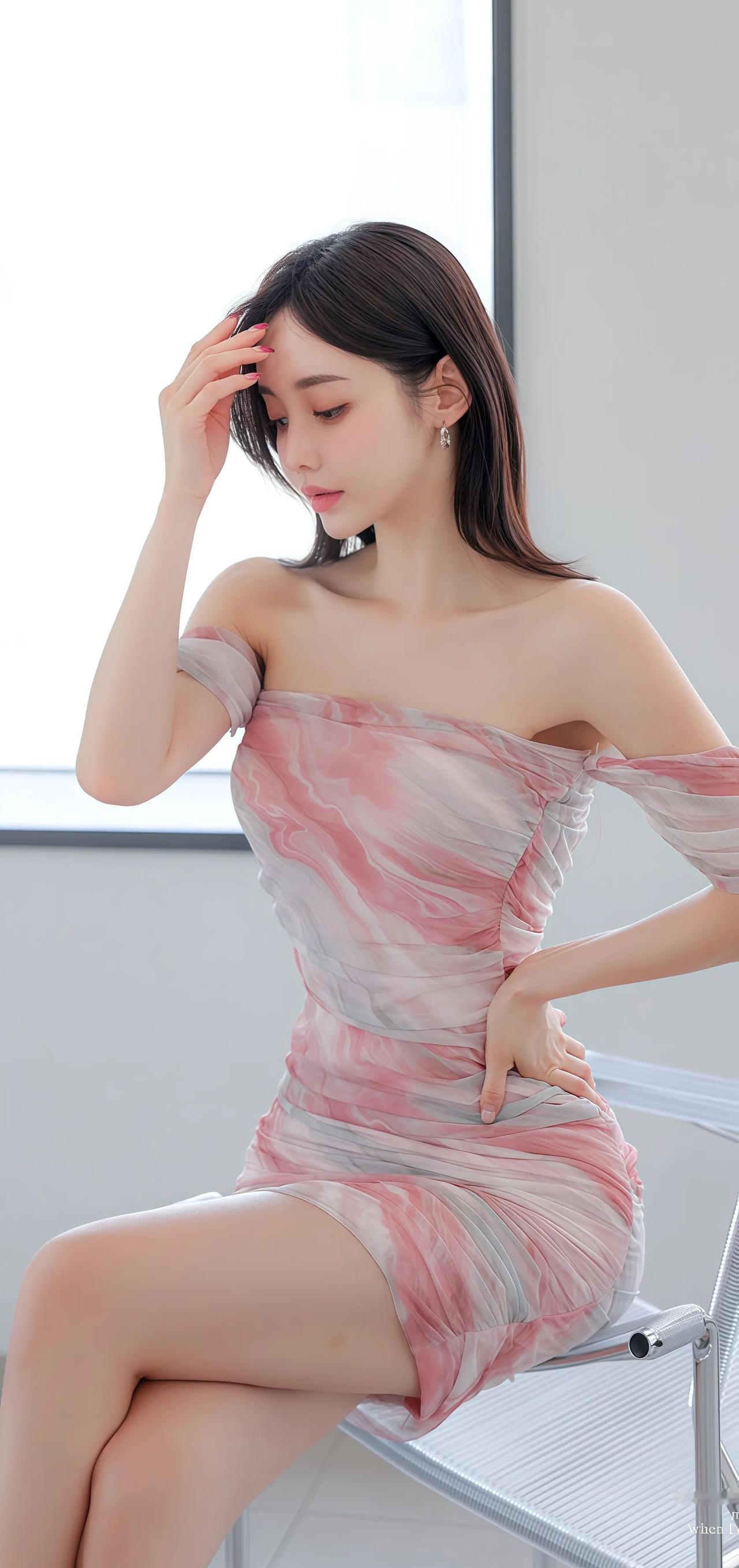 粉色连衣裙的甜美诱惑,白色砖墙背景下的优雅姿态。