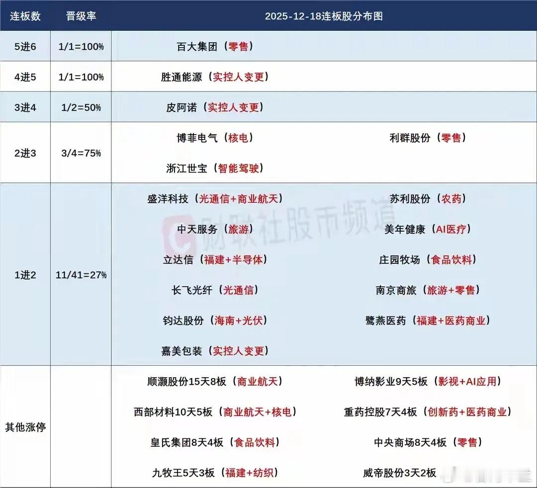 12月19日盘前预案:美股科技回暖,谨防资金回流科技带崩短线抱团环境!1、昨天的市场走势比较分化,科技方向因为老美科技重创出现明显下杀,资金再次抱团消费和商业航天方向,使得整个市场分化非常严重,但是量能是明显缩量,这表明前天追涨科技的资金大部分选择了躺平硬扛,在本周最后一个交易日前,美股科技走出了明显修复,中概股大涨,A50红盘震荡,外围整体趋势比较好,再加上日本降息即将落地,整个市场氛围是不错的,市场有望迎来一轮冲高表现,昨天杀跌的科技很可能出现大幅修复,所以今天整个大盘的情绪可能会是向好的!2、百大早盘弱转强后顶住分歧强势上板,午后却随着市场跳水出现资金抢跑砸盘兑现,虽然勉强封住涨停,但是整体趋势是偏弱的,再加上今天面临严重异动,所以昨天的资金抢跑也就不难理解了,它今天的正常预期是很低的,但是不排除有资金强势做多去挑战严重异动,毕竟这个市场需要一个破局者,而往往最高标的破局更值得期待,毕竟之前的市场已经证明最近挑战严重异动都是死翘翘,所以百大今天的预期是很低的,而它一旦开盘表现极差,对于整个短线情绪会有明显影响,所以今天整个零售可能会有较大分歧,那么百大开盘的表现就可以看成短线零售整体表现的风向标,只要它走的并不是太弱,就算它不准备挑战异动,整个零售就可能会有高低切换,那么低位或许会有强势的补涨出现,就像当初东百断板时百大强势承接走出2板!永辉的表现是整个零售强度的重要参考,如果它能够稳住趋势,那么零售至少不会太烂,那么百大只要不开盘直接闷杀跌停,或许还存在接力龙头首阴的价值,毕竟小群大概率依然格局,如果永辉出现持续下杀,整个零售就可能相当危险了!3、商业航天方向迎来了强修复,但是板块已经几乎没有高标了,午后甚至出现了兑现潮,盛洋是唯一二板个股,但是它昨天的一字是明显放量的,今天也是分歧预期,它能否走出类似再生的表现值得关注,毕竟同样是一字板起步,同样是商业航天方向,它或许会走出类似表现,所以它今天能否在早盘走出一个放量承接的晋级形态是可以重点关注的!顺灏是老龙头表现最强势的个股,但是它毕竟是缩量涨停,隔日竞价如果不是特别强势,一旦板块走弱,它是很可能开盘即巅峰的,所以这只个股半路接力反而风险较大,如果能强势一字板开,对于整个商业航天带动就会非常明显了!西部高位连续阳线后出现了一个强势涨停板,这样的表现是绝对强势的,如果商业航天有持续性,它甚至比顺灏更适合走出来,毕竟它是新高表现,只要开盘足够强,至少有资金愿意去承接硬顶的!总得来说,整个商业航天今天早盘很可能定生死,毕竟是连续炒作了近一个月的方向,昨天午后强势中军卫星出现了炸板,这是明显转弱的信号,隔日早盘如果明显不妙,整个商业航天就很可能走出结束的趋势,之后可能更多的会是零星的鱼尾行情,更多的像平潭、合富和海峡一样,除了它们三个,其他的福建方向几乎没有参与价值了!4、如果老周期集体回调熄火,市场肯定会有新方向崛起,从昨天的表现看,医药方向可能会是资金比较好的一个去处,鹭燕的一字板非常强势,一旦它能继续大单一字板,对于整个板块的带动会非常明显,那么同样二板的美年就非常有接力价值了,一旦竞价出现大幅高开,就是直接抢筹了,跟当初华菱一字带动中超是一样的道理!5、合富也有医药概念,所以它昨天表现的特别强势,但是这样的表现持续的话是很可能延长监管的,参考平潭的走势,隔日或许会继续有所突破,但是异动可能也会来到,3日20%,隔日上涨超4个点就会突破,就看资金如何选择了,所以对于合富来说,这个位置反而不是很适合接力了,或许等待是更好的方式!平潭和合富是福建方向两个穿越周期的代表,只要大盘偏弱,资金往往会向它们抱团,这是整个12月份的趋势,反之,一旦大盘向好,它们反而没有特别耀眼的表现,这两只个股近期的独立性也越来越明显,只要一只活着,另外一只就算回调,也不会轻易结束,而它们一起完蛋的话,反而就容易开始持续兑现了,所以对于这两只妖股,把握接力的时机最为重要!本文只限于分享和交流,不构成投资建议,股市有风险,投资需谨慎!