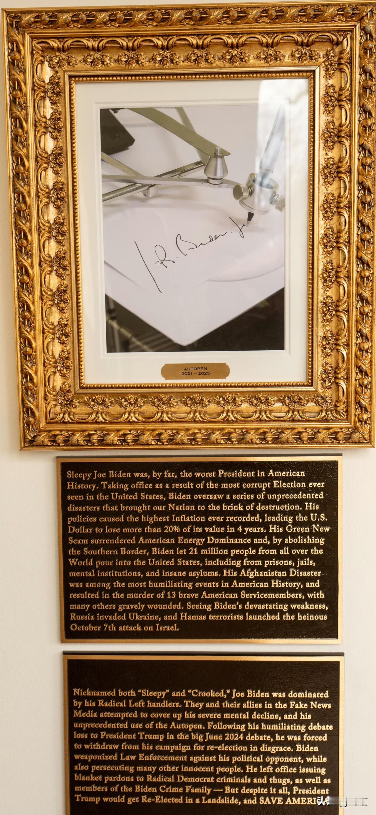 白宫总统星光大道「拜登铭文」 瞌睡乔·拜登毫无疑问是美国历史上最差的总统,他因美国有史以来最腐败的大选而上台执政,期间发生了一系列前所未有的灾难,将我们国家推到了毁灭的边缘;他的政策导致了有史以来最高的通货膨胀,致使美元在四年里贬值超过 20%;他的“绿色新政骗局”让美国失去了能源主导地位,而且通过废除南部边境管控,拜登让来自世界各地的2100万人涌入美国,其中包括来自监狱、看守所、精神病院和疯人院的人;他在阿富汗的灾难性决策是美国历史上最耻辱的事件之一,导致 13 名勇敢的美国军人丧生,还有许多人重伤。由于看到拜登的软弱无力,俄罗斯入侵了乌克兰,哈马斯恐怖分子在10月7日对以色列发动了令人发指的袭击。 绰号“瞌睡”和“骗子”的乔·拜登被激进左派的操纵者们掌控;他们及其在假新闻媒体中的盟友试图掩盖拜登严重的智力衰退以及他前所未有使用自动签名笔的行为;在2024年6月那场令人大跌眼镜的辩论中惨败于特朗普总统之后,拜登被迫在耻辱中退出竞选连任;拜登动用执法部门对付政治对手,还迫害了许多无辜的人;卸任时,他对激进民主党罪犯、暴徒以及拜登犯罪家族成员进行了赦免。 但尽管如此,特朗普总统仍将以压倒性优势胜选,并拯救美国!