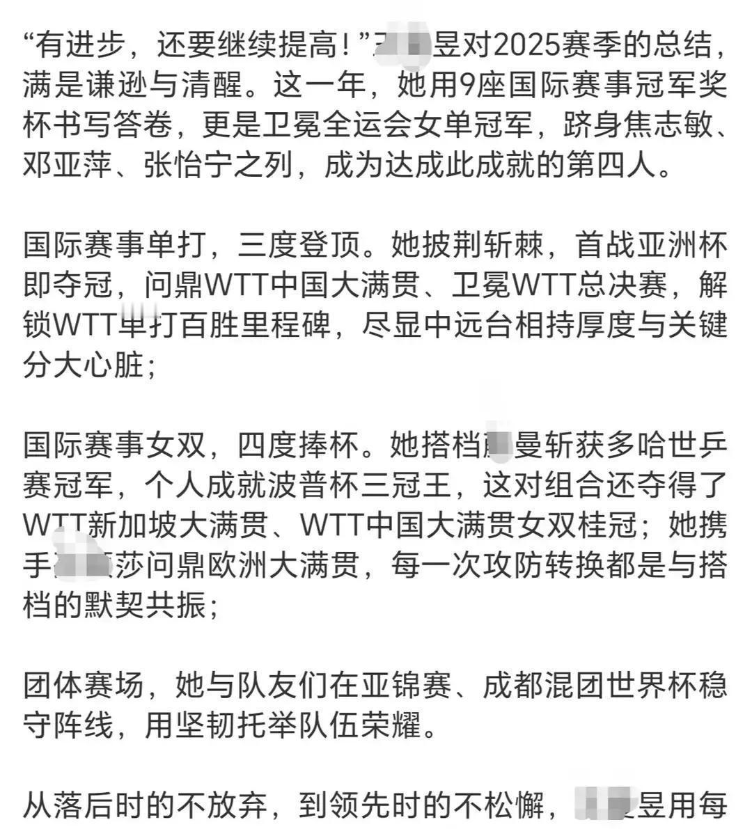 别盯着王曼昱的冠军荒了。她手里攥着一张“免死金牌”,国乒教练组半夜都得琢磨这张牌。 不是孙颖莎,也不是陈梦。压住王曼昱最后一根稻草的,是一套冰冷的积分算法。队内第三,大赛扣分,规则像秒表一样追着她跑。巴黎的门票,看实力,更看算式。 但你得看这个数据:过去32个月,外协选手没从她手里赢过一个系列赛。早田希娜、伊藤美和,最猛的冲击波都被她正面挡回去。国乒最硬的“外战防火墙”,名字叫王曼昱。 教练组面临一道残酷选择题:要一个状态飘红但外战吃过亏的老将,还是要一个外战稳如磐石却输过内战的尖兵?大赛爆冷输外战,是国乒绝对的红线。王曼昱就站在这条线上,一动不动。 她真正的战场不在球台,在心理关。关键分胜率比去年提升了18%,但世锦赛、世界杯那几个赛点,差的就是一口气。高手对决,最后收割的不是技术,是血管里那点冰冷的狠劲。 所以别只算她缺什么冠军。算算她替整个队伍扛住了多少压力。巴黎的名单需要冠军,更需要一座绝不塌方的堤坝。 冠军定义一年,但斗士定义一代人。她守住的,远比夺下的更沉重。