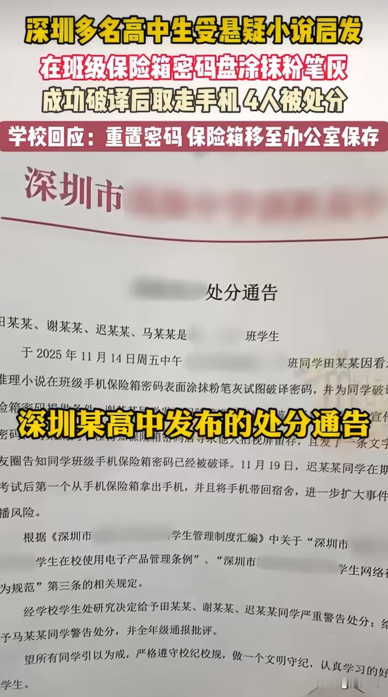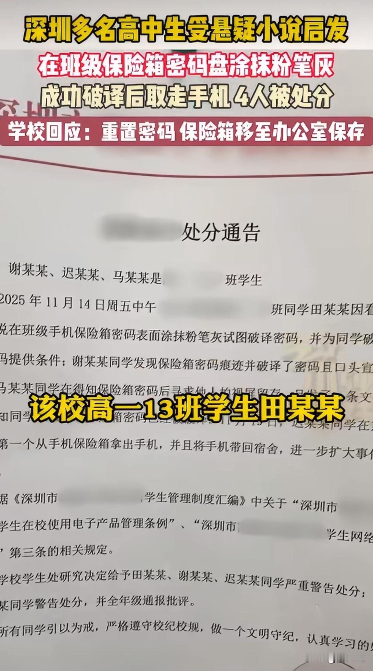 “深圳高中生火了!”深圳高一13班多名学生,竟受悬疑小说启发,协同破解了班级手机保险箱密码,不仅传播密码还私取手机,最终被校方依规处分,学校随后将保险箱重置密码并移至办公室保管。 此事一出,网友炸开了锅!有网友说: “这届学生太牛了!把小说知识活学活用,就是用错了地方!” 也有网友表示: “学校别光处分,不如顺势引导,搞个密码科普社团多好!” 周少认为这群孩子的观察力与逻辑思维,其实藏着难得的学习天赋。这件事恰恰给家庭教育和学校管理提了个醒:孩子的好奇心与探索欲,堵不如疏。 与其简单处分打压,不如搭建正向的实践平台,把这份“歪才”引向编程、逻辑推理等有益领域,让孩子的聪明才智真正发光发热。#寻美三湘# #长沙新朋友#