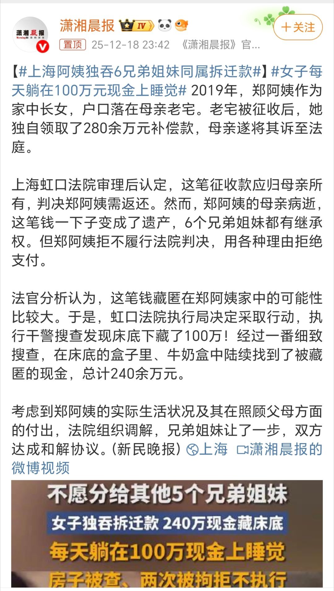躺在100万上睡觉是一种什么样的的感觉真想试试,可惜没有啊!上海阿姨独吞6兄弟姐妹同属拆迁款咋说呢?最终结局还是不错的。