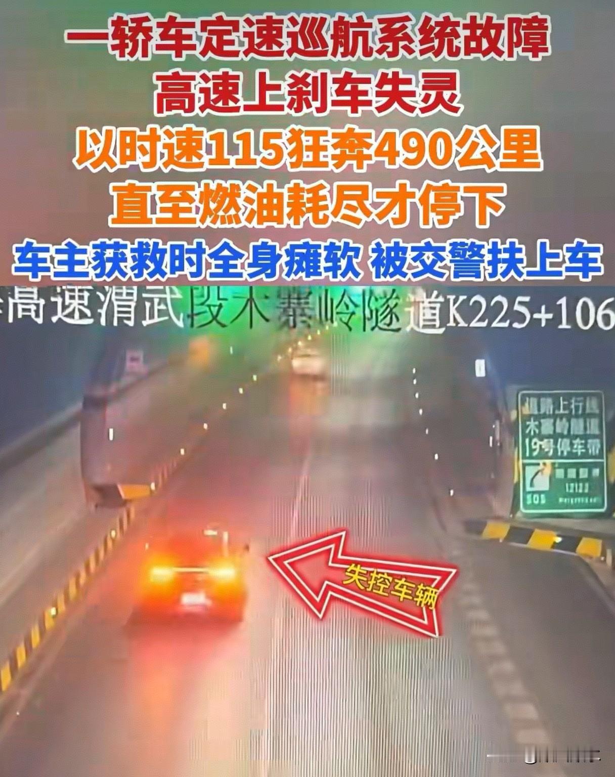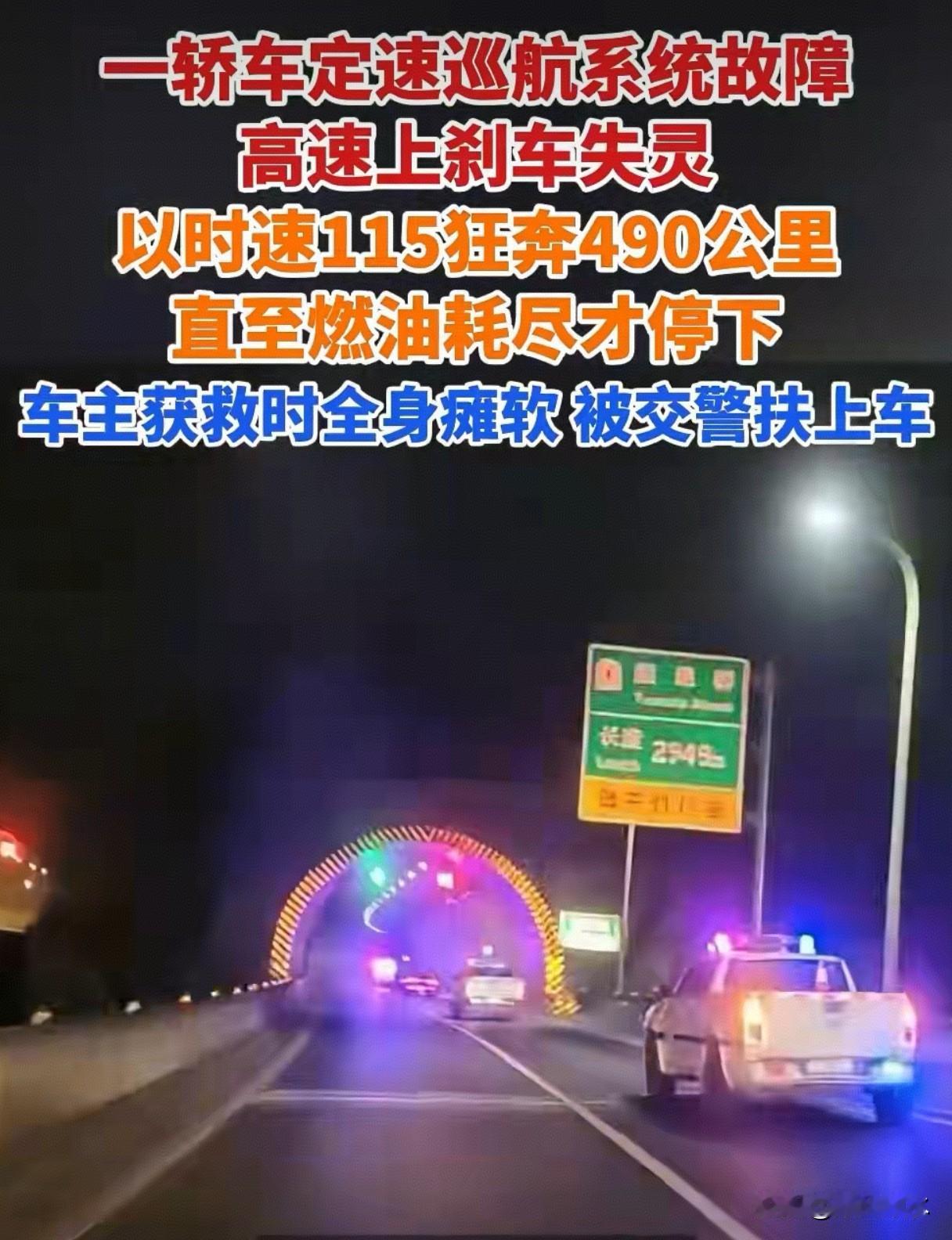 小车高速失控490公里,交警路政“护航编队”救了命! 12月17日晚,G75高速上一小车定速巡航故障,刹车踩不动,以115公里时速跑了490公里,直到油烧完才停下! 车辆设备故障(定速巡航失灵连带刹车失效),高速失控极危险,稍有不慎就撞车,危及自身和他人安全。 交警前面开道、路政后面压阵,组“护航编队”接力控速,体现应急机制的高效。 生死关头,不是一个人在硬扛,是“众人拾柴”的守护——这“护航”暖的不仅是车,更是每个在路上的人心!