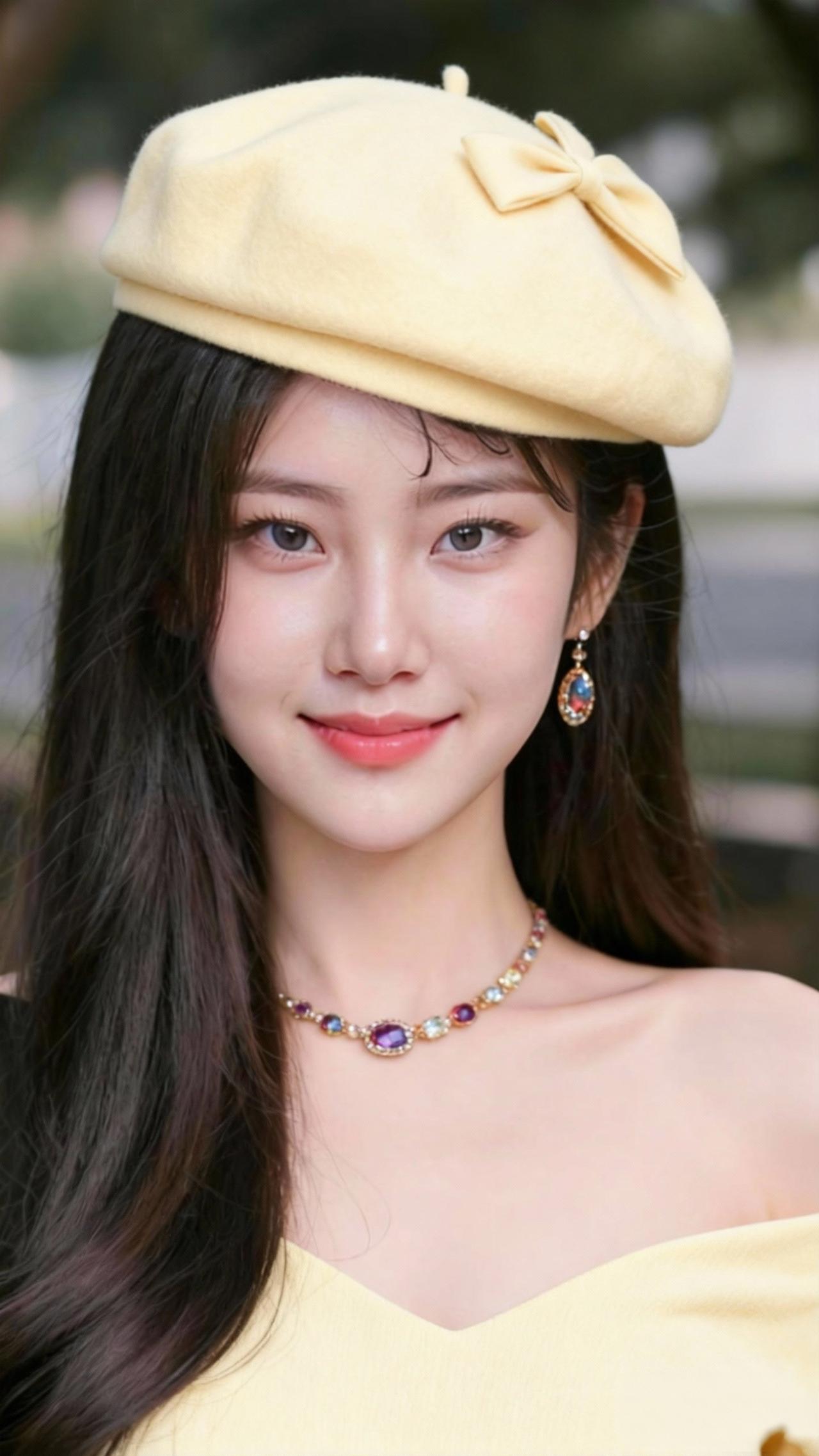 甜美少女风,黄色贝雷帽搭配珍珠项链,清新可爱!🌸💎