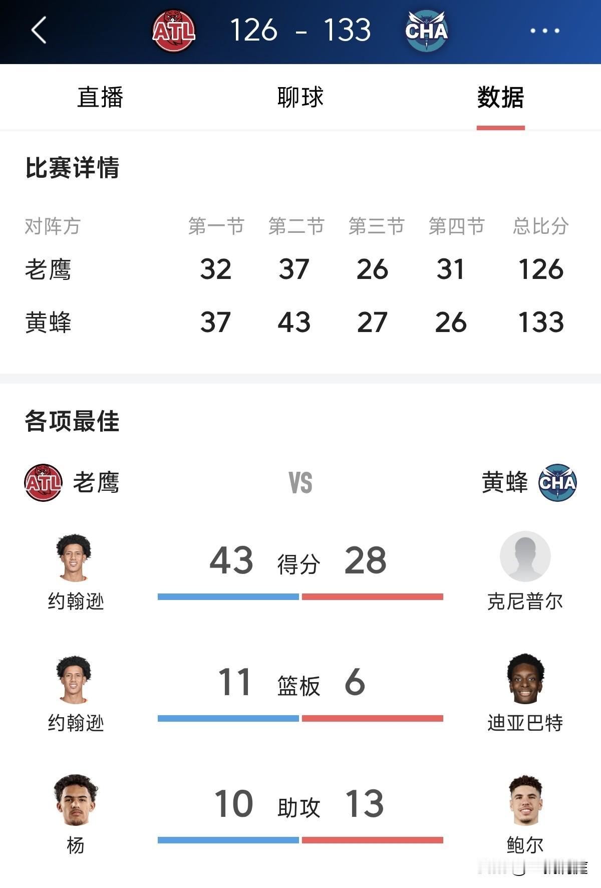 约翰逊40+准三双,特雷杨复出,老鹰客场不敌黄蜂 北京时间12月19日,黄蜂主场133比126战胜老鹰,本场比赛特雷杨复出打了20分钟拿到8分10助攻,约翰逊拿到43分11篮板9助攻,现在这只老鹰是属于他的了。 黄蜂队新秀普尔投中五个三分球拿到28分5篮板7助攻,鲍尔28分13助攻4篮板。这支球队的老大估计也是要争一争了。