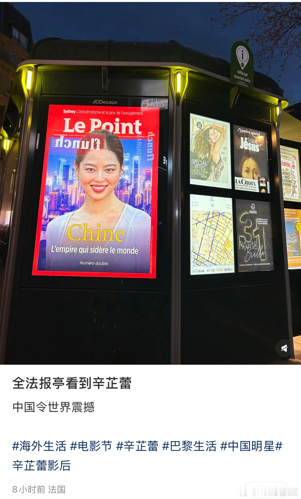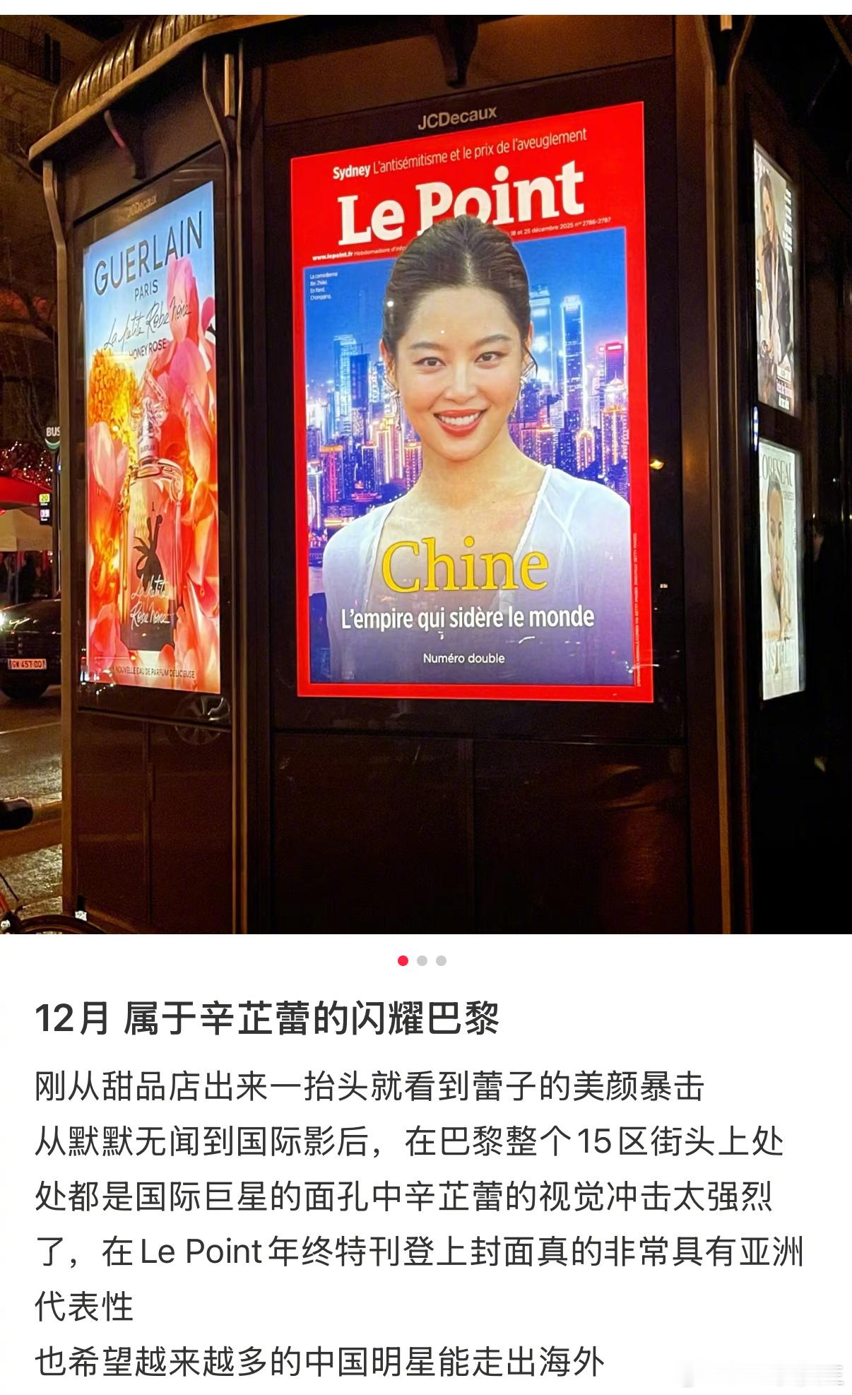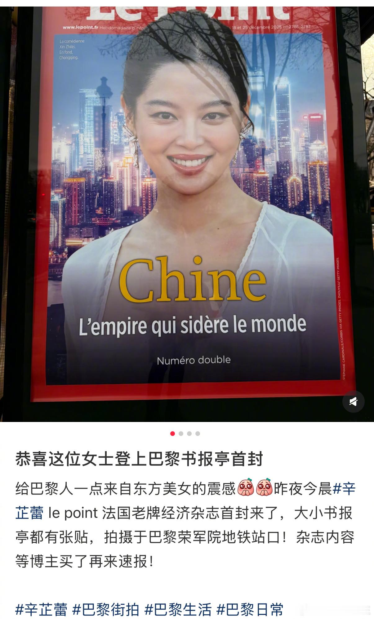 辛芷蕾登法国新闻周刊《Le Point》封面,这本是法国著名的新闻时事周刊杂志,也是法国三大主要新闻周刊之一,这本杂志也在巴黎街头全线投放。
