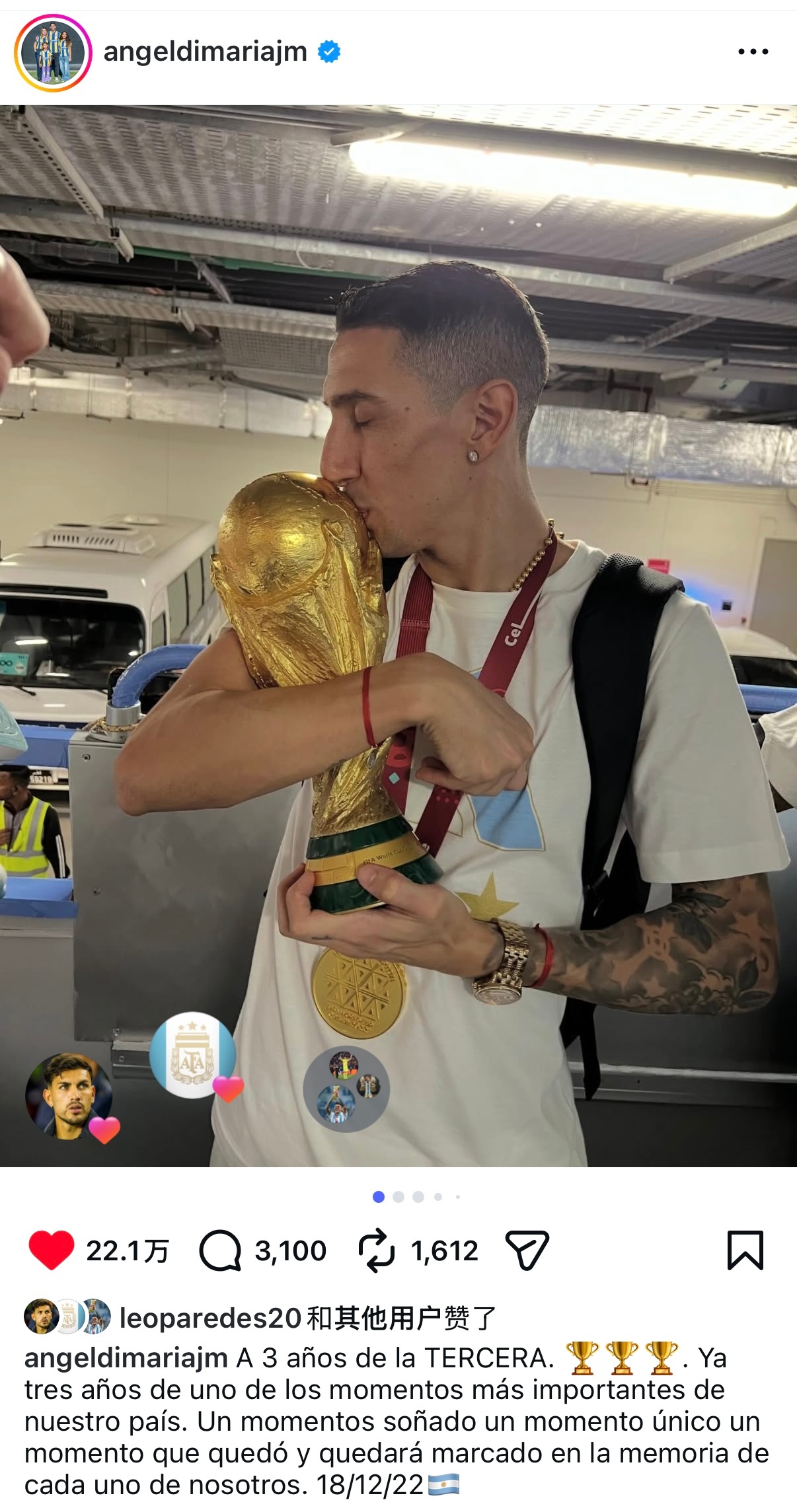 迪马利亚ins|距离夺得世界杯已经过去三年了。🏆🏆🏆。三年前,我们国家迎来了最重要的时刻之一。梦想成真,独一无二的时刻,一个永远铭刻在我们每个人记忆中的时刻。2022年12月18日🇦🇷阿根廷球迷俱乐部