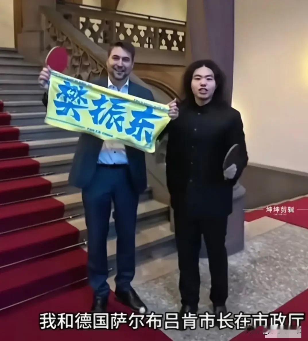 这就是樊振东在德甲的排面! 某个华裔小提琴家,他和萨尔布吕肯的当地市长,一起用中文横幅,给樊振东加油的,这则视频在外网火了。 现在的樊振东,绝对是萨尔布吕肯的头号风云人物,他一人盘活了当地的球市,当地的旅游,当地的人气。 萨尔布吕肯市长,拿着着樊振东的横幅,用不流利的中文喊出:樊振东加油! 这就是樊振东的排面🤩
