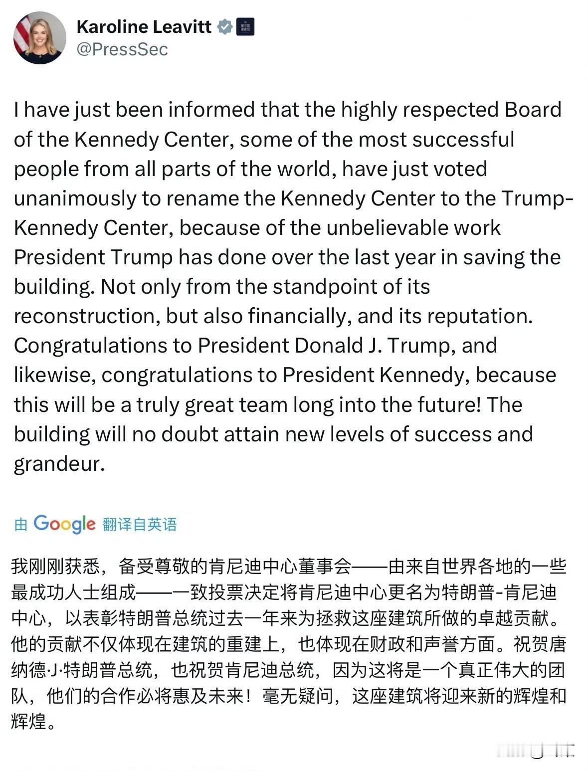 白宫新闻发言人莱维特发文:肯尼迪艺术中心董事会成员一致投票决定,将肯尼迪中心更名为「特朗普-肯尼迪中心」。