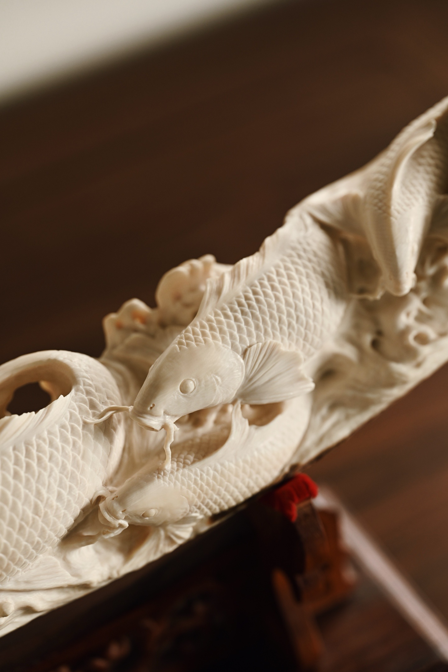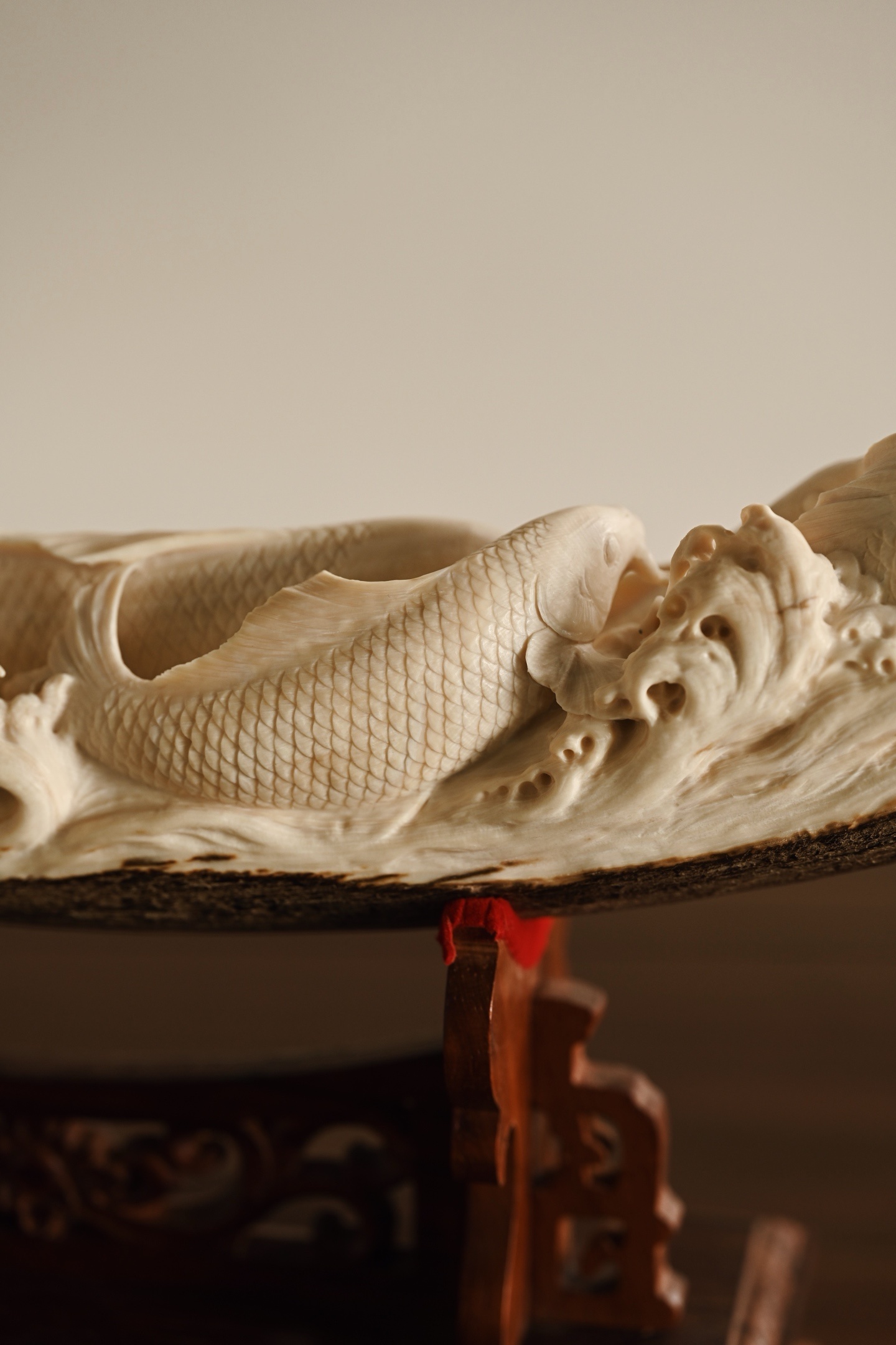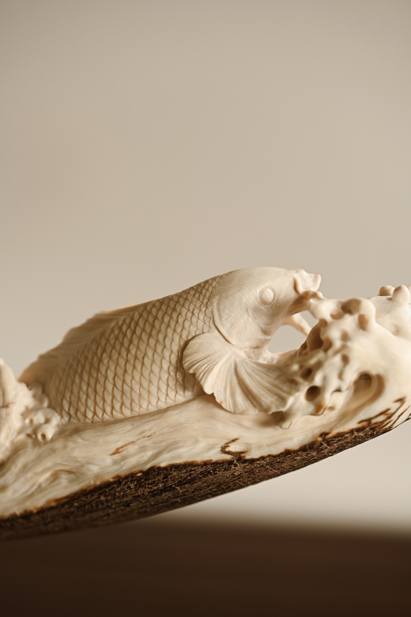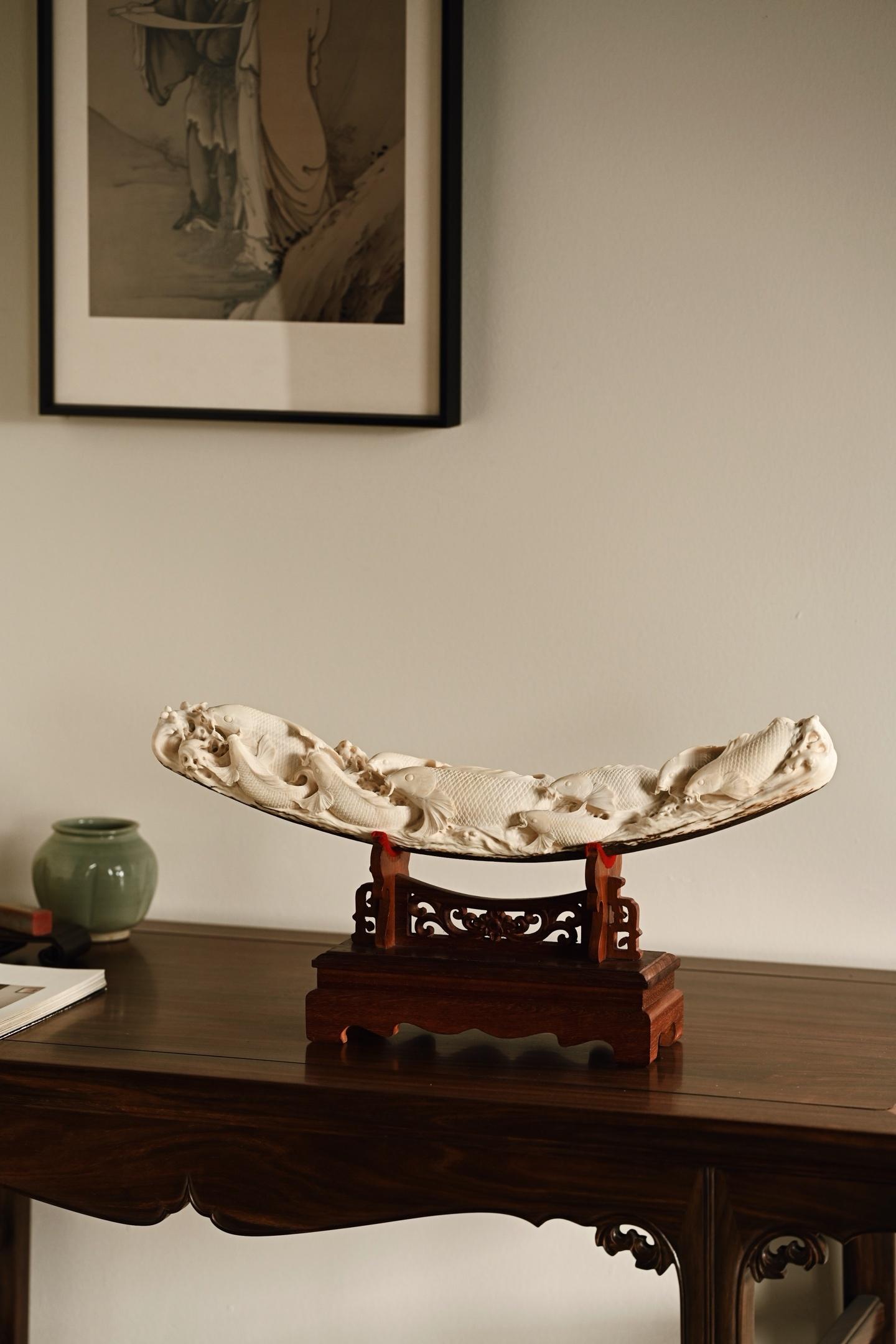 猛犸 | 吉庆有余 摆件整料雕刻,底部带原皮,鲤鱼腾波,姿态矫健,神态威猛,鱼须飞扬,鳞片精细刻画,波涛翻卷,极富动感、层次感,鱼谐音“余”,象征吉祥与祥瑞。48.5*10*23.5cm 1779g