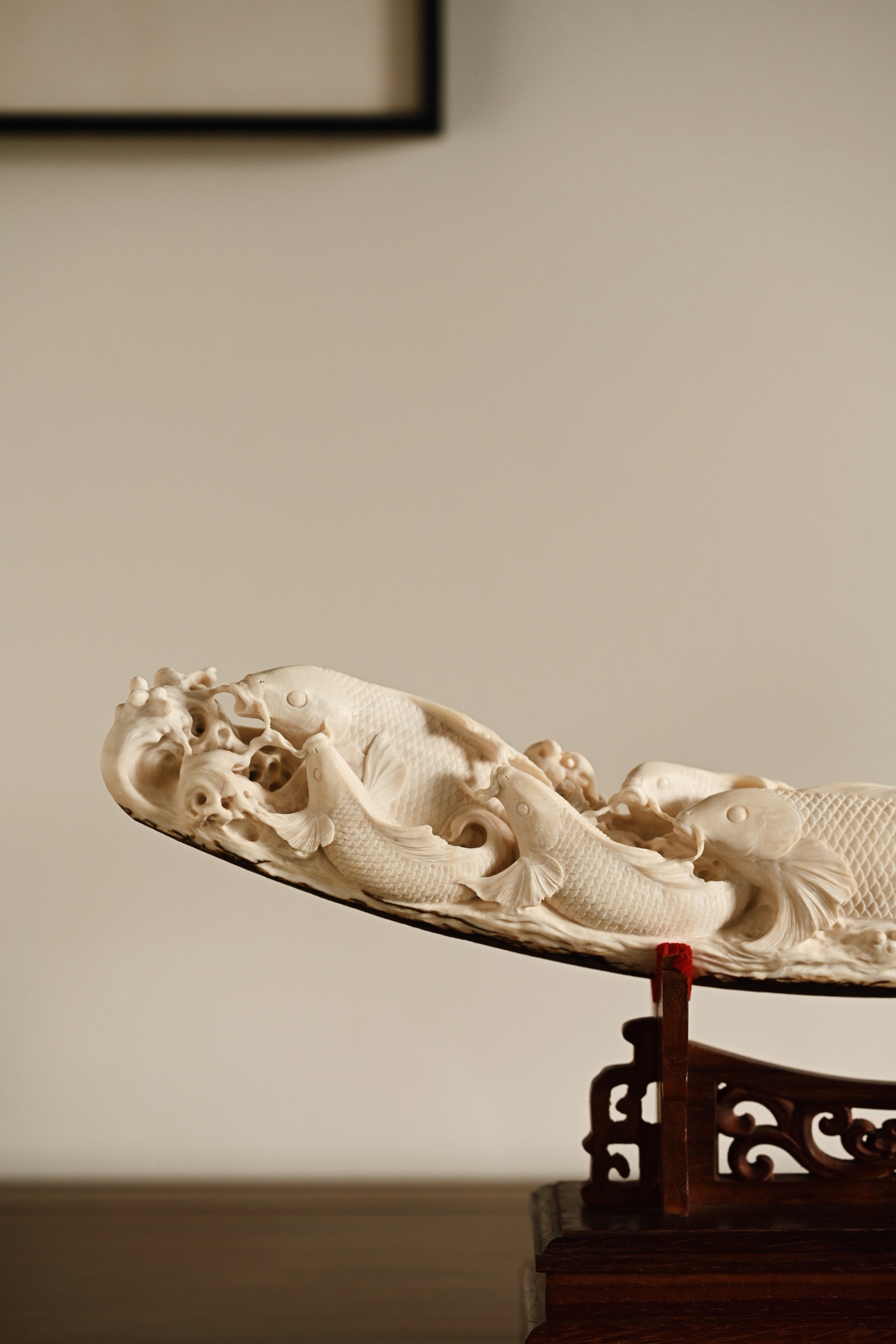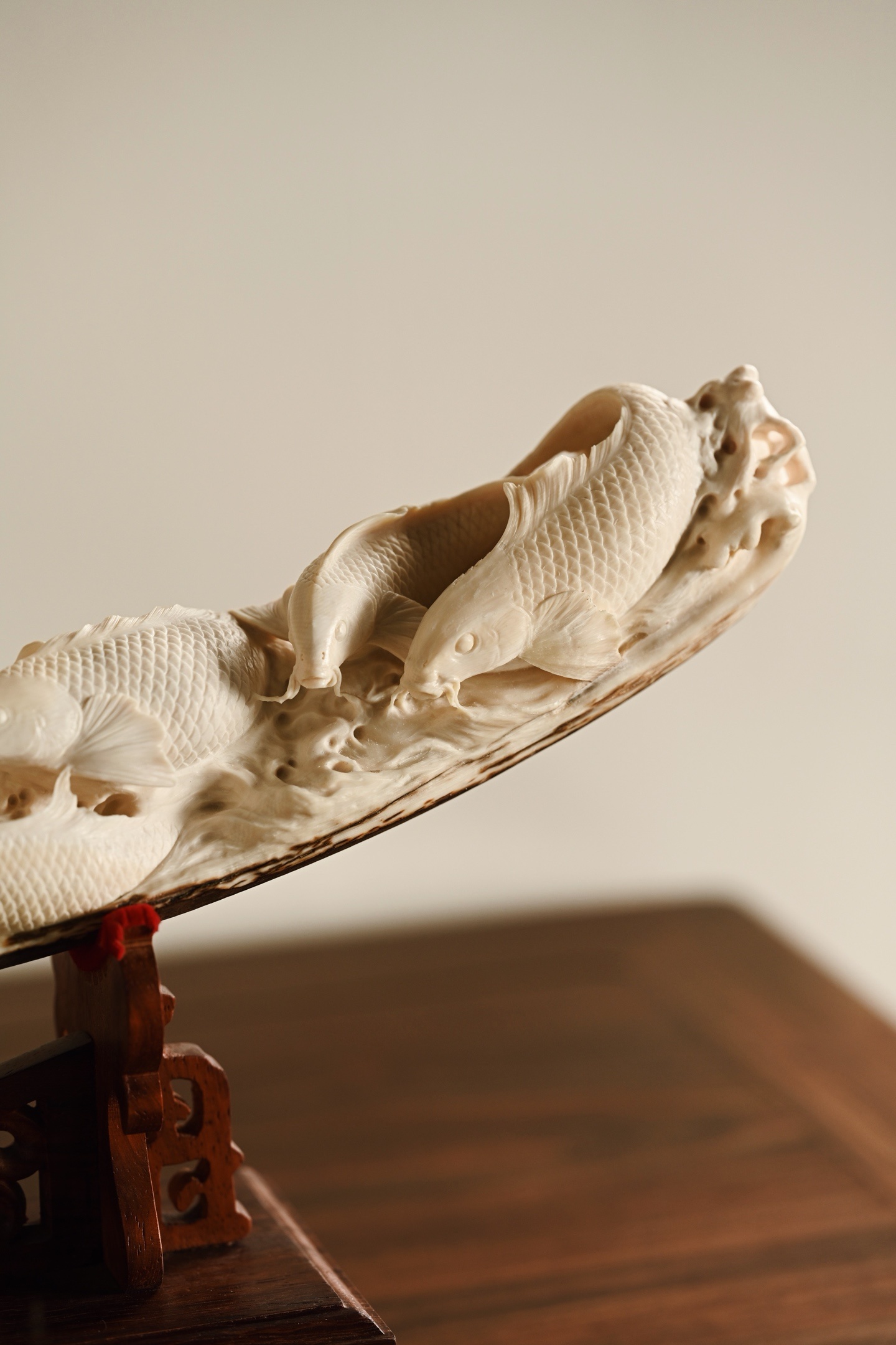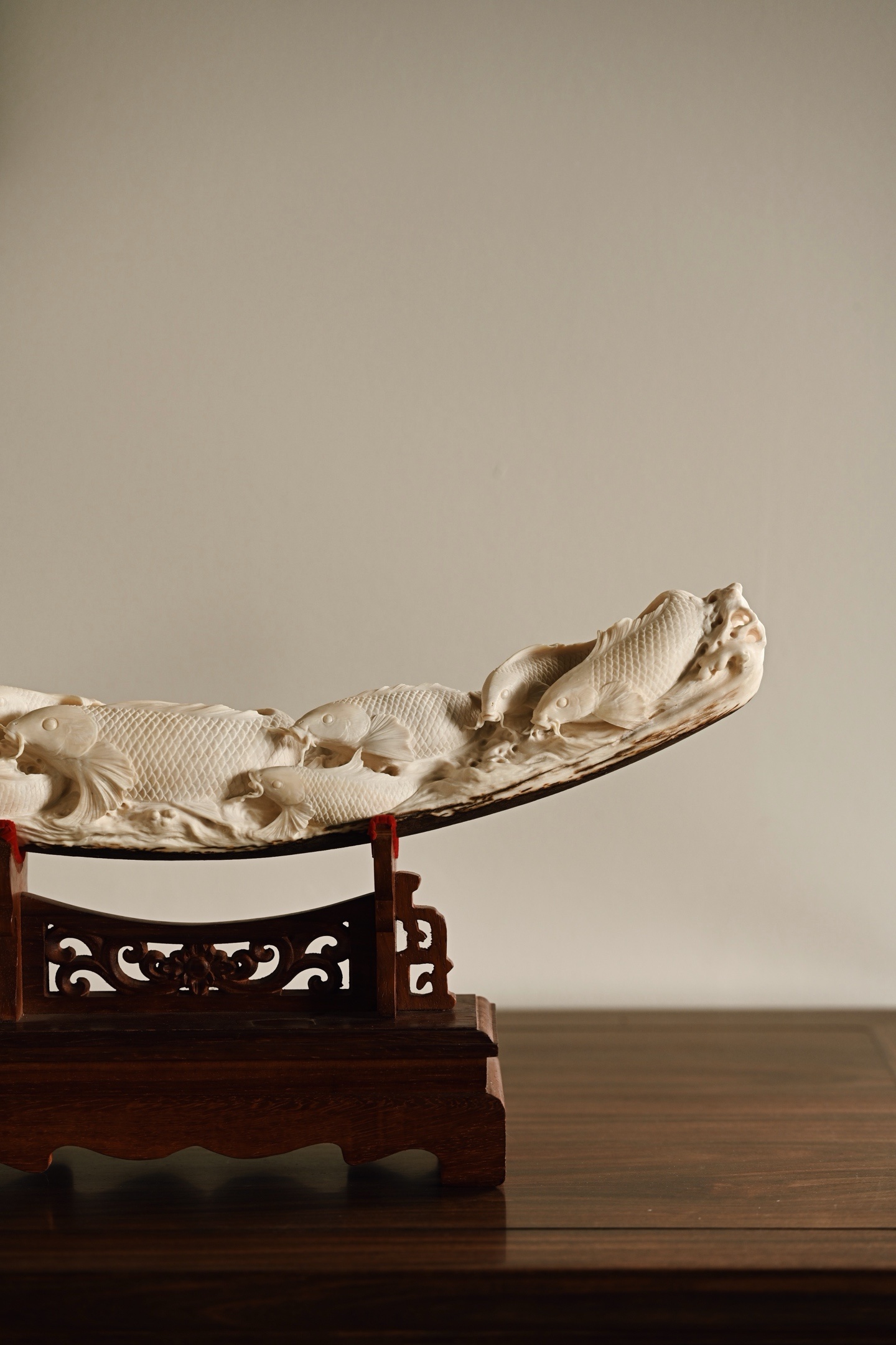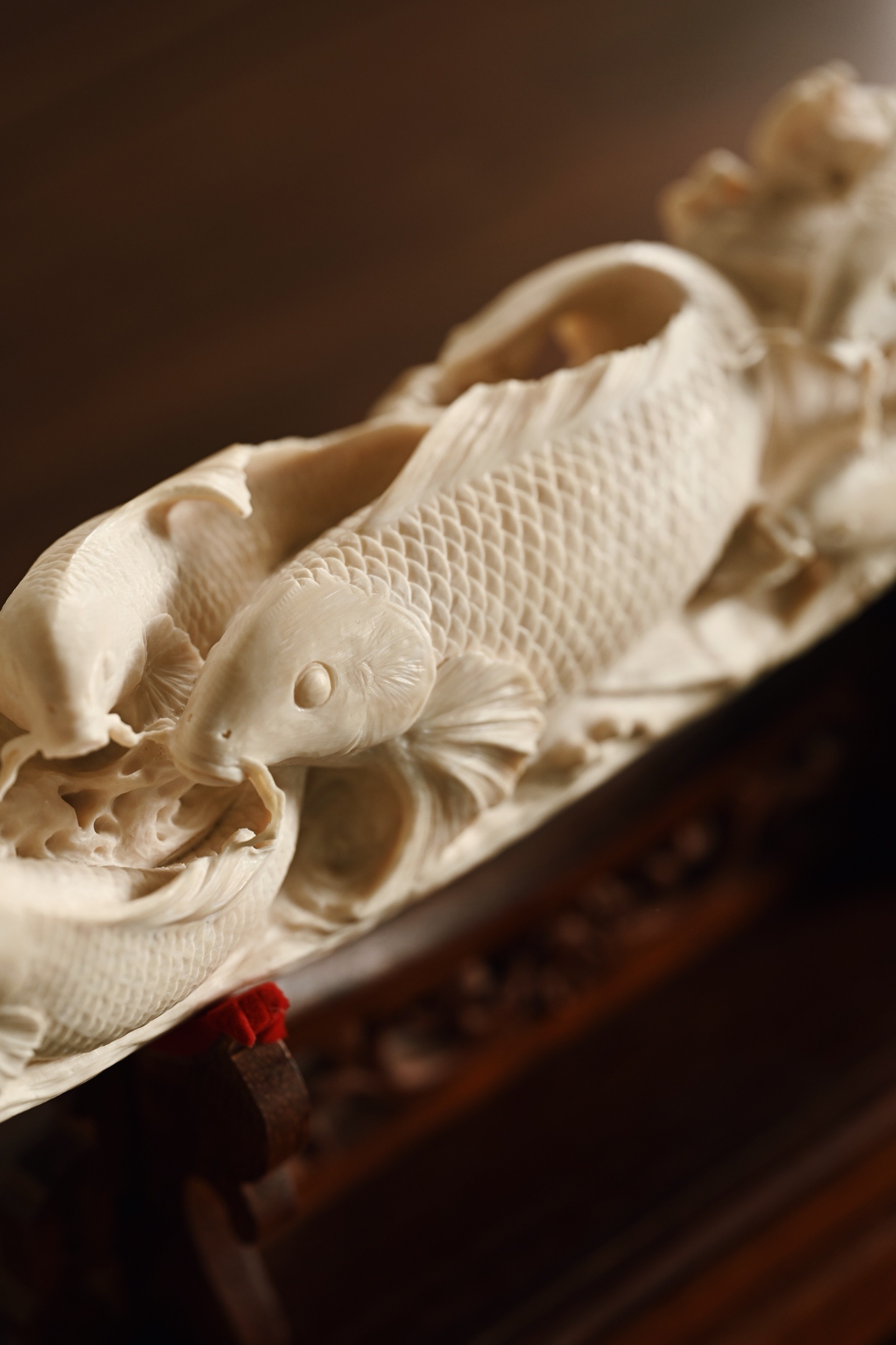 猛犸 | 吉庆有余 摆件整料雕刻,底部带原皮,鲤鱼腾波,姿态矫健,神态威猛,鱼须飞扬,鳞片精细刻画,波涛翻卷,极富动感、层次感,鱼谐音“余”,象征吉祥与祥瑞。48.5*10*23.5cm 1779g