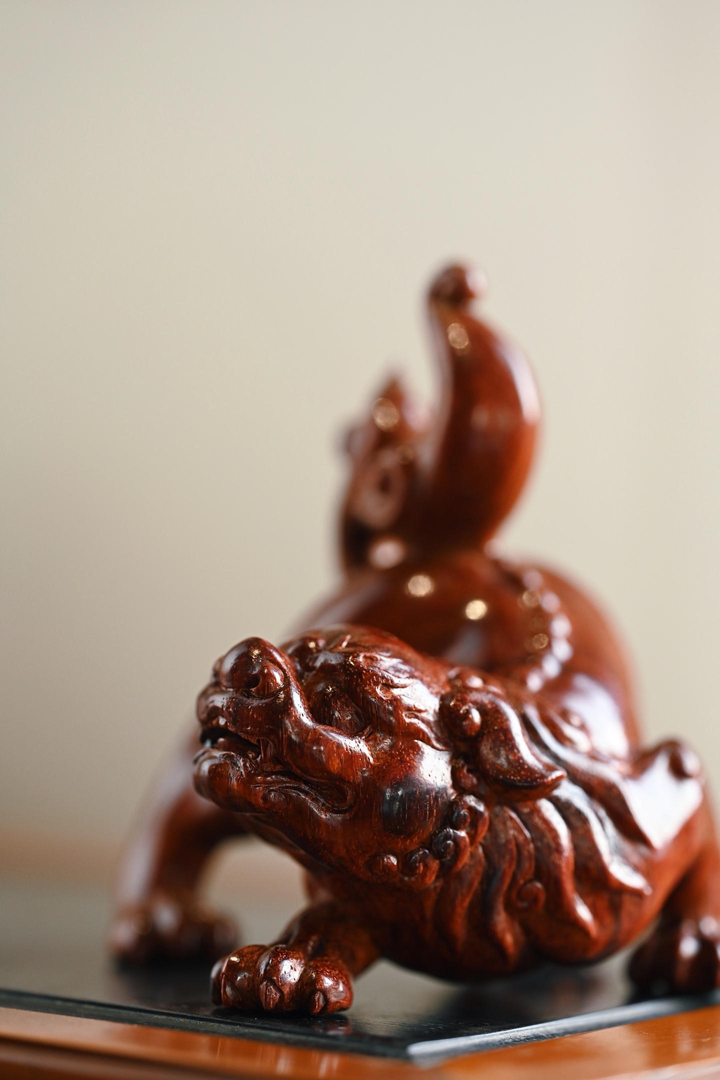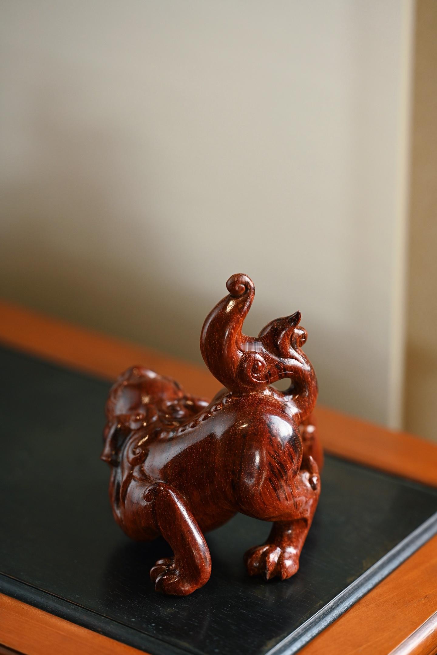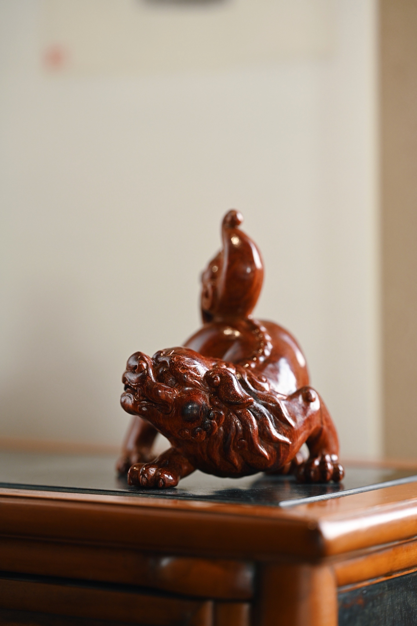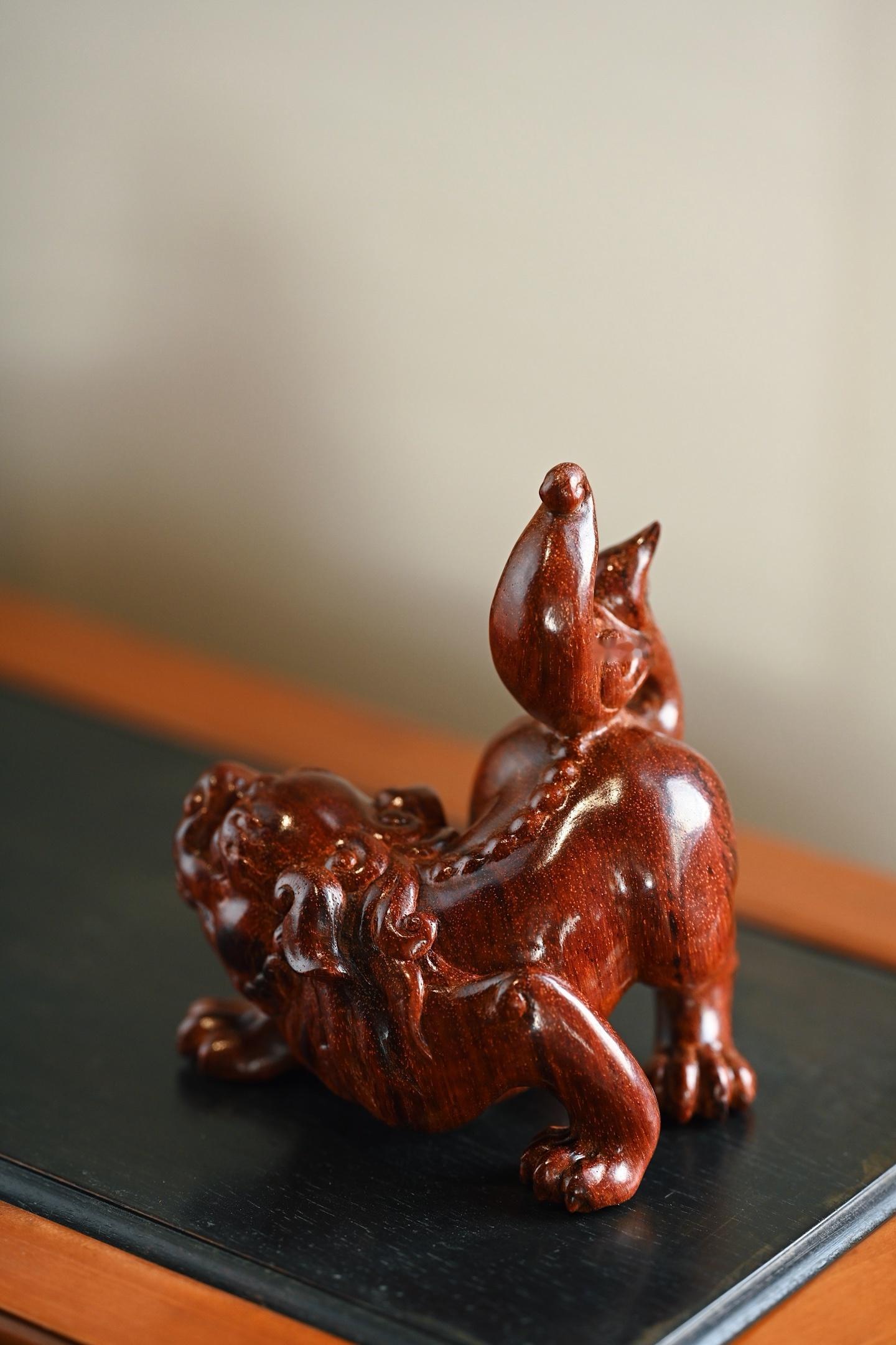 小叶紫檀 | 瑞狮整料雕刻,线条流畅,刀法张弛有度,狮子造型圆润饱满,灵气十足,鬃毛卷曲自然,置于案头赏玩,彰显不凡贵气。9.2*9.2*10cm 160g